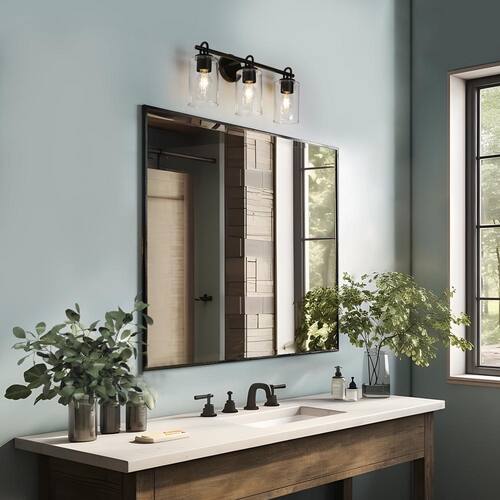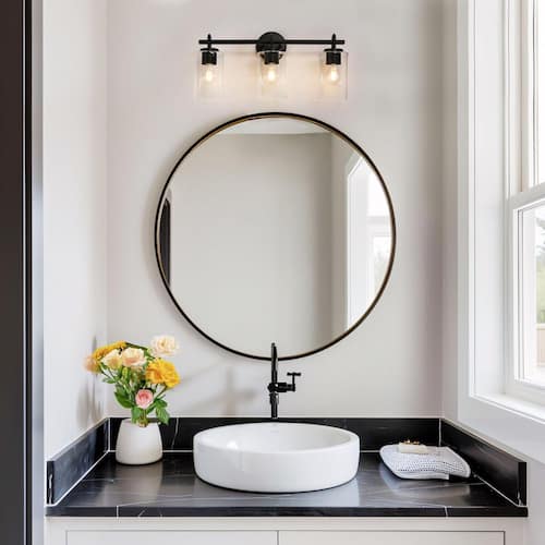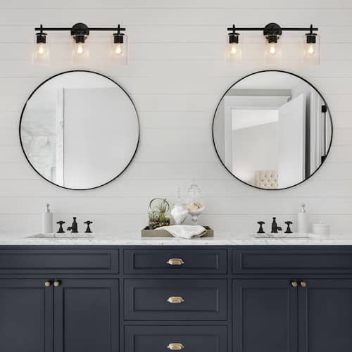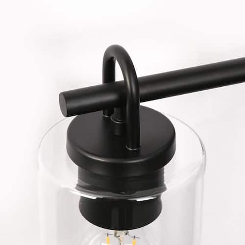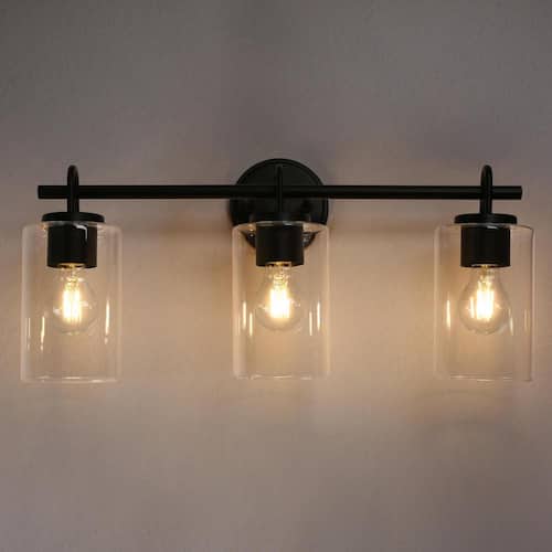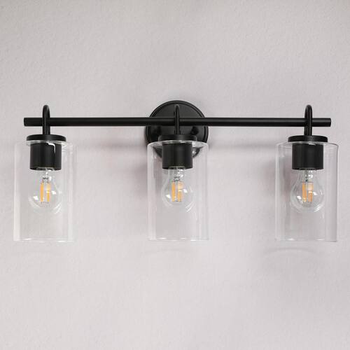 About This Product:Enhance the contemporary style of your bathroom with the 3-light modern black bathroom vanity light with cylinder clear glass shades. Crafted with a sleek black finish and designed with modern aesthetics in mind, this wall light fixture will instantly elevate the look of your space. The three clear glass shades allow ample light to shine through, creating a bright and inviting atmosphere. Whether you´re getting ready for the day ahead or winding down at night, this contemporary wall sconce provides the perfect blend of functionality and style.