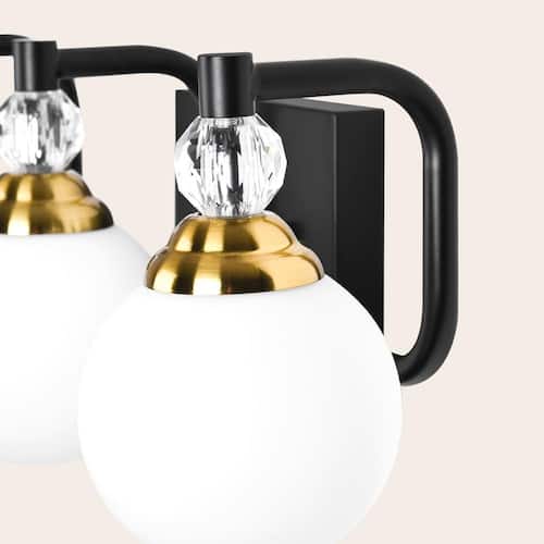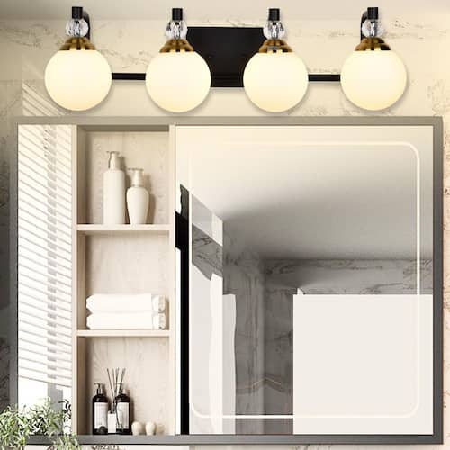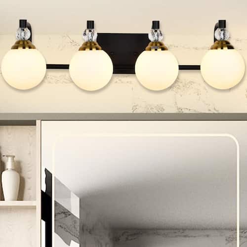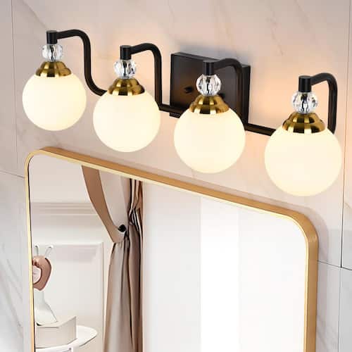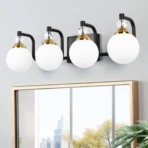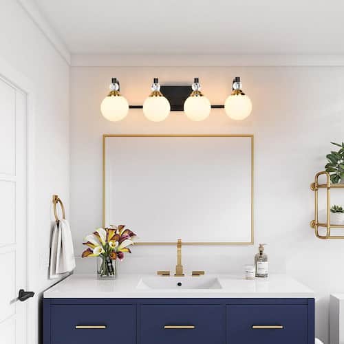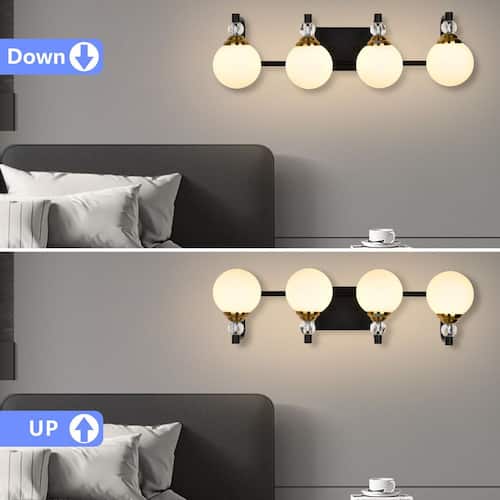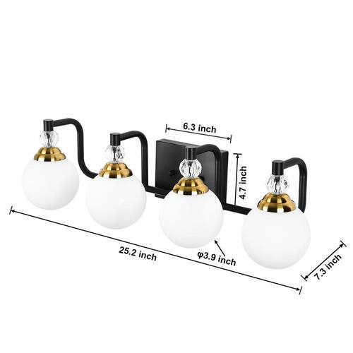 About This Product:Elevate your bathroom or bedroom with this stunning 4-light vanity fixture that masterfully blends modern sophistication with timeless elegance. The rich black frame with luxurious gold accents creates a striking two-tone design, while the frosted white globe shades provide soft, diffused lighting perfect for grooming and relaxation. This vanity light can also be mounted up or down to your liking, and is fully dimmable using a dimmable bulb and a compatible dimmer switch (note: bulbs and dimmers are not included).
