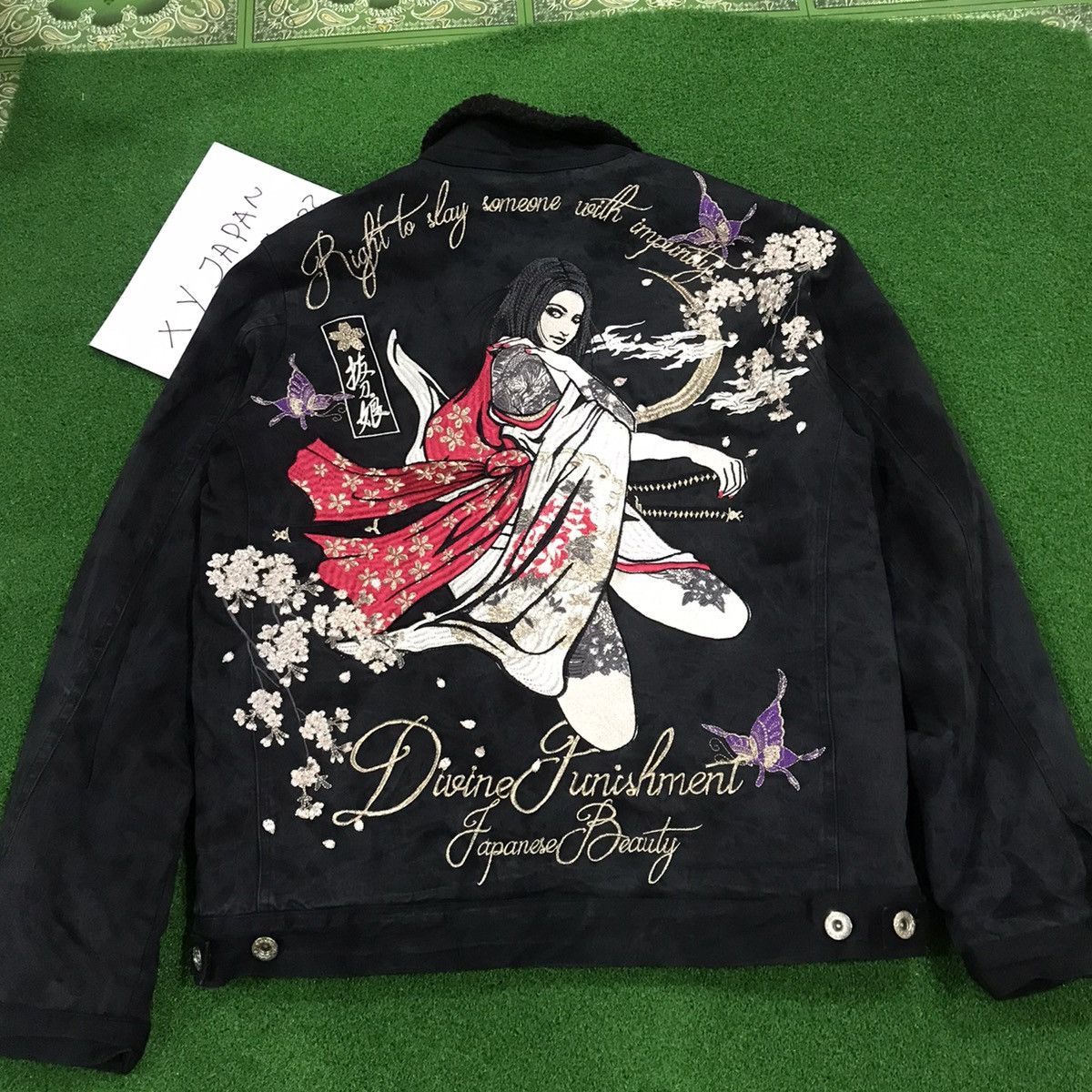 Item : Rare Divine Retribution Embroidery japan traditional sukajan motive trucker jacket sherpa lining*Good used condition*Size on tag M