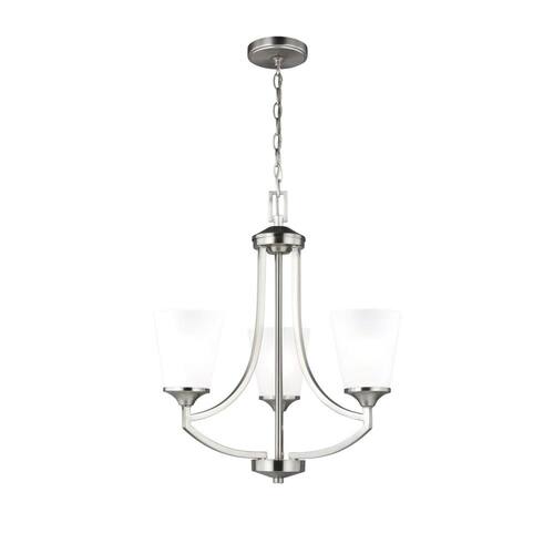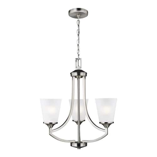 About This Product:The Sea Gull Collection Hanford 3-light single tier chandelier in brushed nickel is the perfect way to achieve your desired fashion or functional needs in your home. The transitional styling of the Hanford lighting collection by Sea Gull Collection is evident in its elegant symmetry articulated by long, sweeping arms. Tapered Etched glass shades produce a soft up light and make Hanford complementary to a wide array of decor from traditional to contemporary. Offered in both Brushed Nickel and Burnt Sienna finishes, the collection includes 5-light, 9-light and 15-light chandeliers, a 3-light hall/foyer light, a 1-light mini pendant, a 3-light pendant, a 3-light semi-flush mount which can convert into a pendant and 1-light, 2-light, 3-light and 4-light bath fixtures. Incandescent and ENERGY STAR-qualified LED lamping are available, all fixtures are California Title 24 compliant.