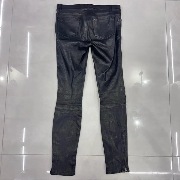 Size 27 Excellent Used Condition.Like NewCOMPOSITION100% LambskinMEASUREMENTSOutside leg 37.05 Inches, Inside leg 26.52 Inches, Width at end 5.07 InchesDETAILSleather, no appliqués, solid color, mid rise, slim fit, multipockets, contains non-textile parts of animal origin, skinny pantsMeasurements: Waist: 14.5Rise: 9Inseam: 28