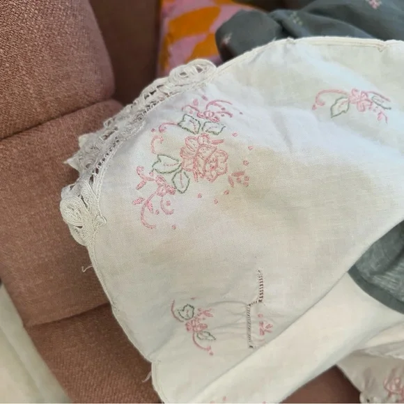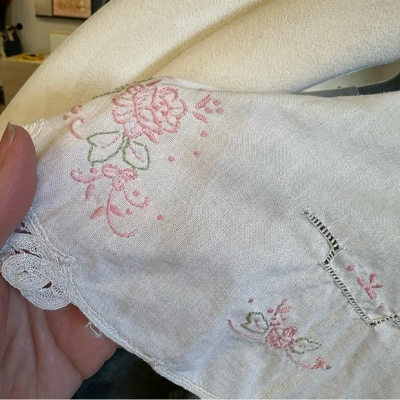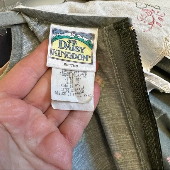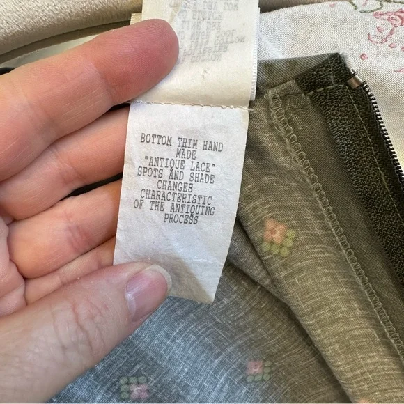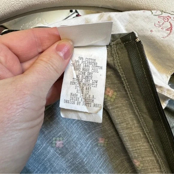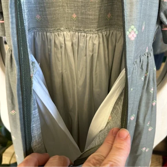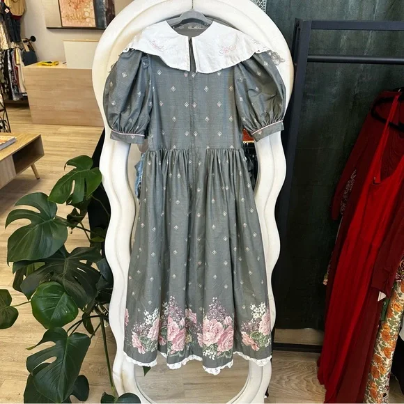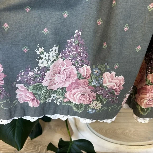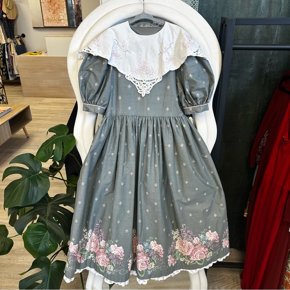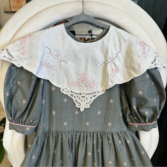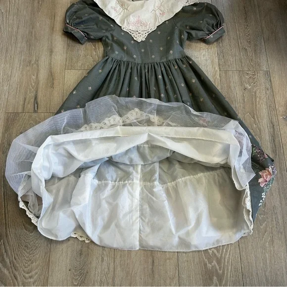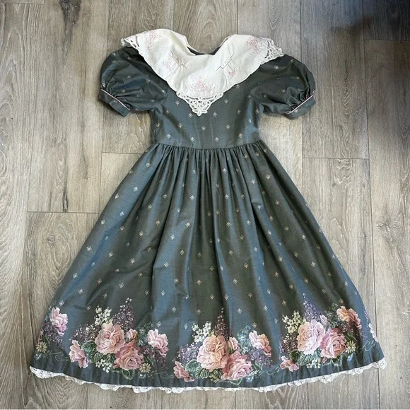 Size 12Measurements laying flat:Chest, armpit to armpit 15”Waist 14”Length, shoulder to hem 41.5”Gray cotton and polyester material with pink and purple flowersHandmade lace on bottom trimWhite Cotton collar with embroidery and lace, discoloration on right shoulder, see picturesBelt loops but no belt, add a pink ribbon for a beltFull skirt with lining and tulleZipper back closureGently used vintage condition