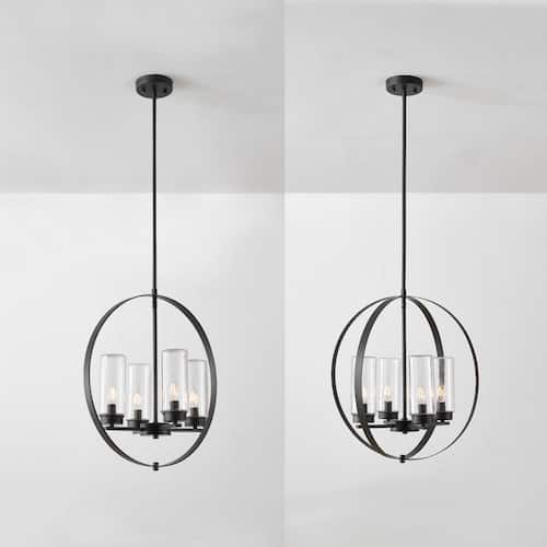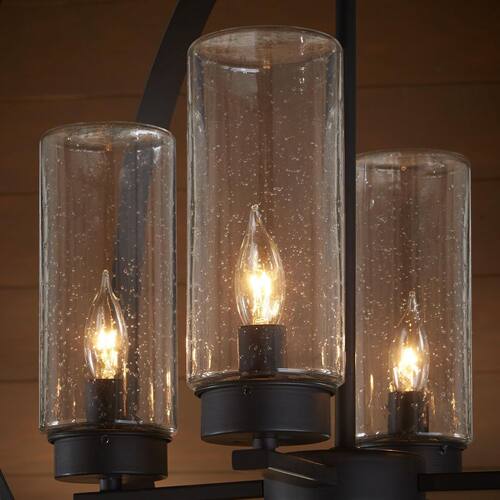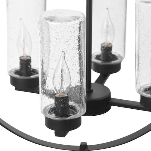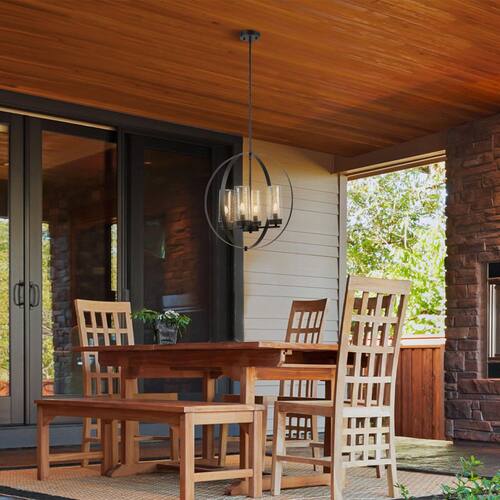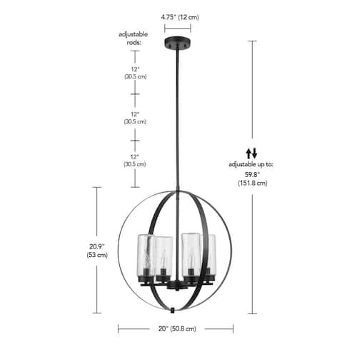 About This Product:A complete marriage between traditional and contemporary design, the Home Decorators Collection 4-Light Chandelier has it all - impeccable style with an open chandelier construction. Easy to incorporate into your existing decor, the dark bronze finish and upscaled traditional design offers a stunning way to light your room. The clear seeded glass shades lets you choose between a variety of bulbs to customize the chandelier and emphasize your own personal style. Let your inner interior designer shine!