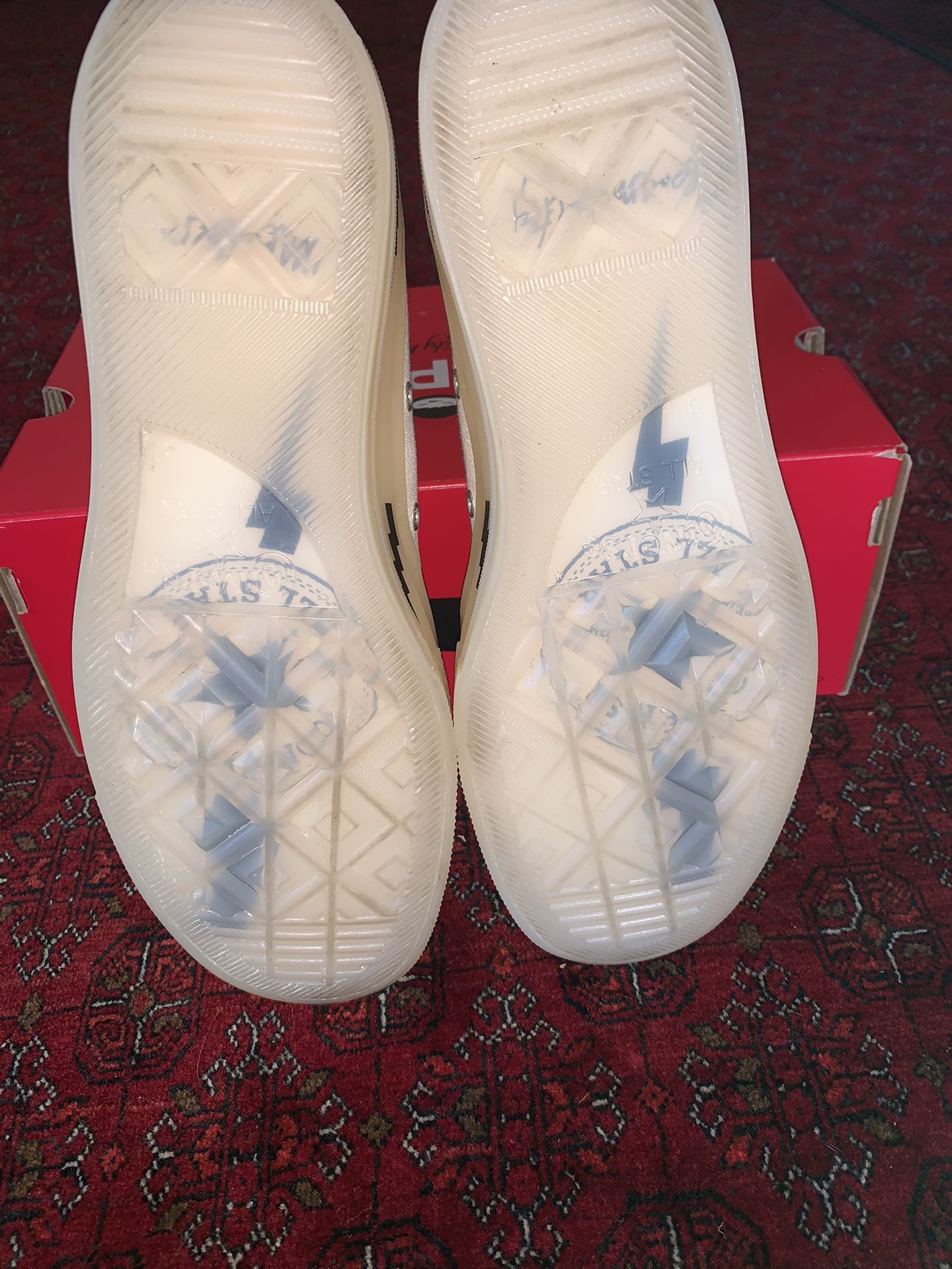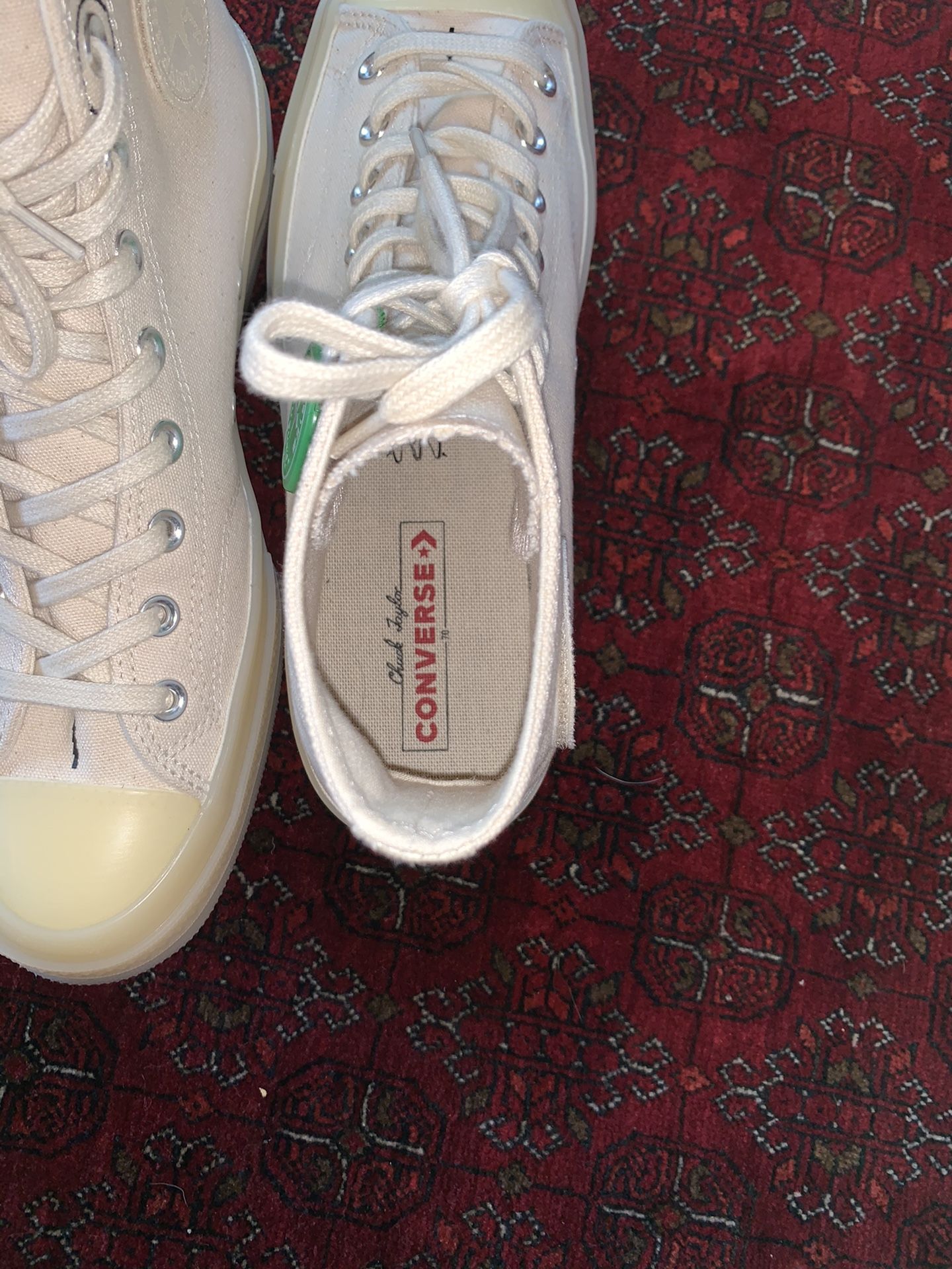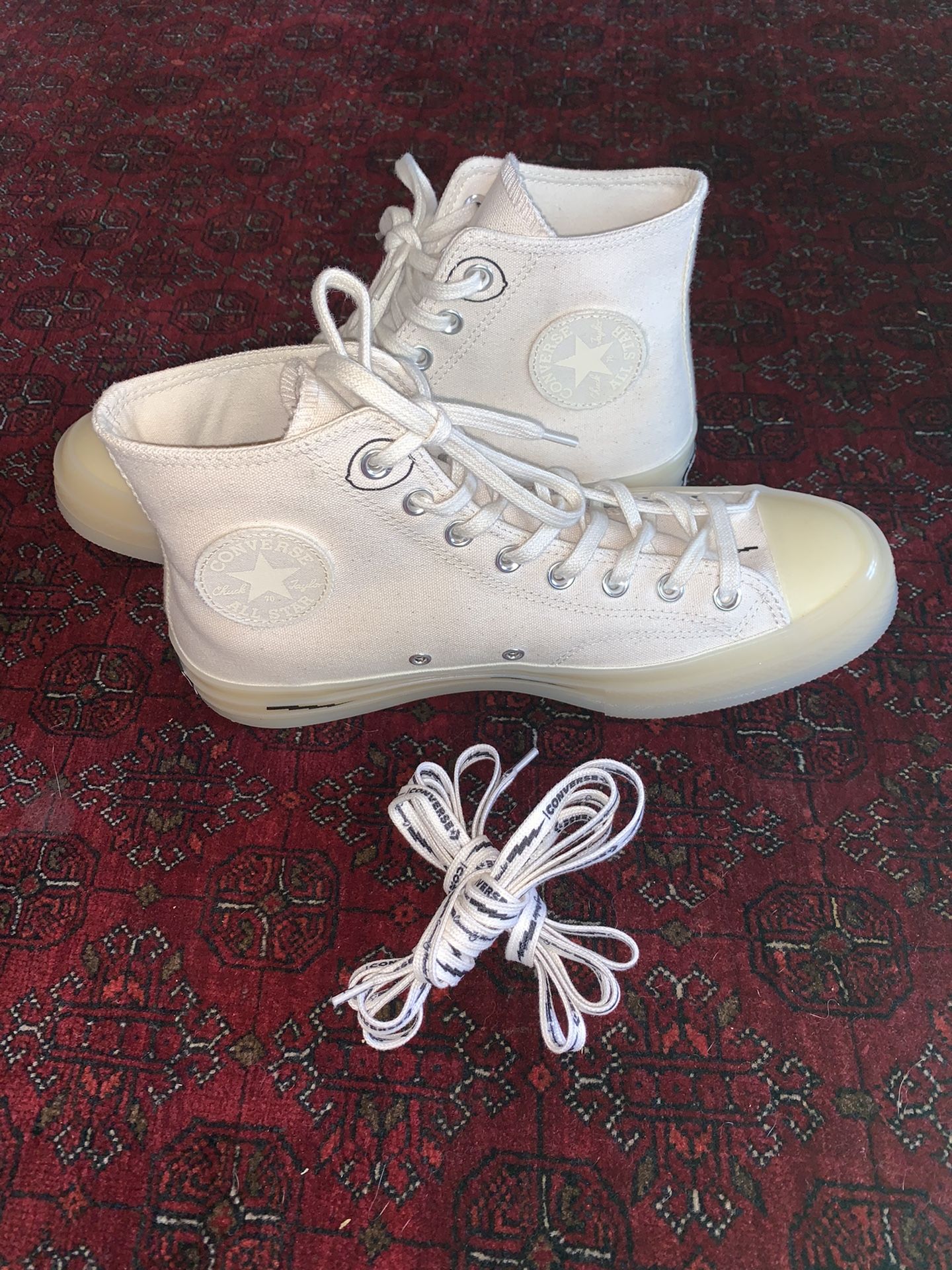 Brand new Converse hi top shoes. I purchased them for about 200. Only tried them on once but it was one size too big. They come with the original box and laces. Note that Converse tend to run 1 or 1 1/2 size bigger so if you are a 9 then you would be an 8 or 7 1/2 in converse. OBO No low ballers!Asking $185
