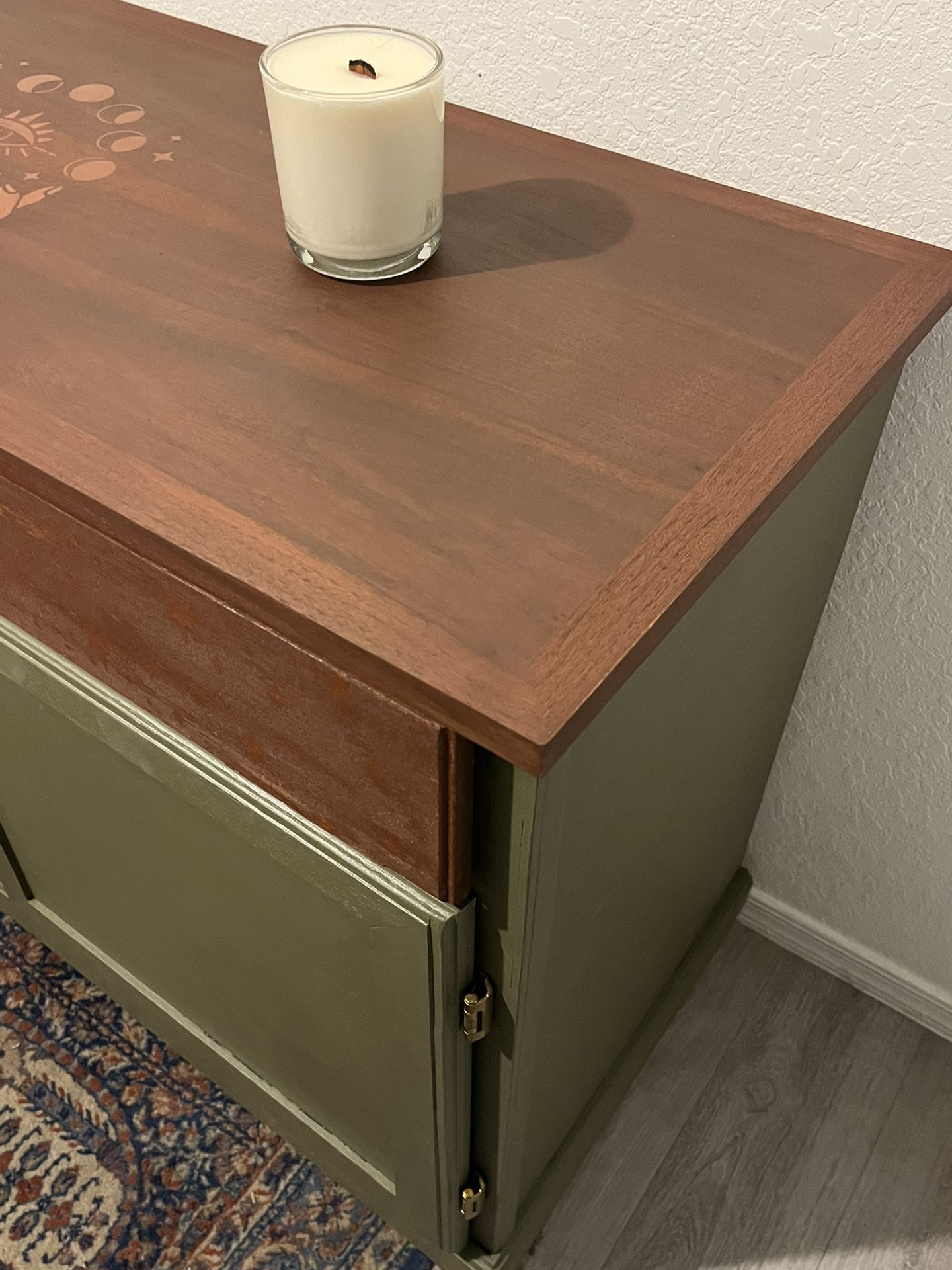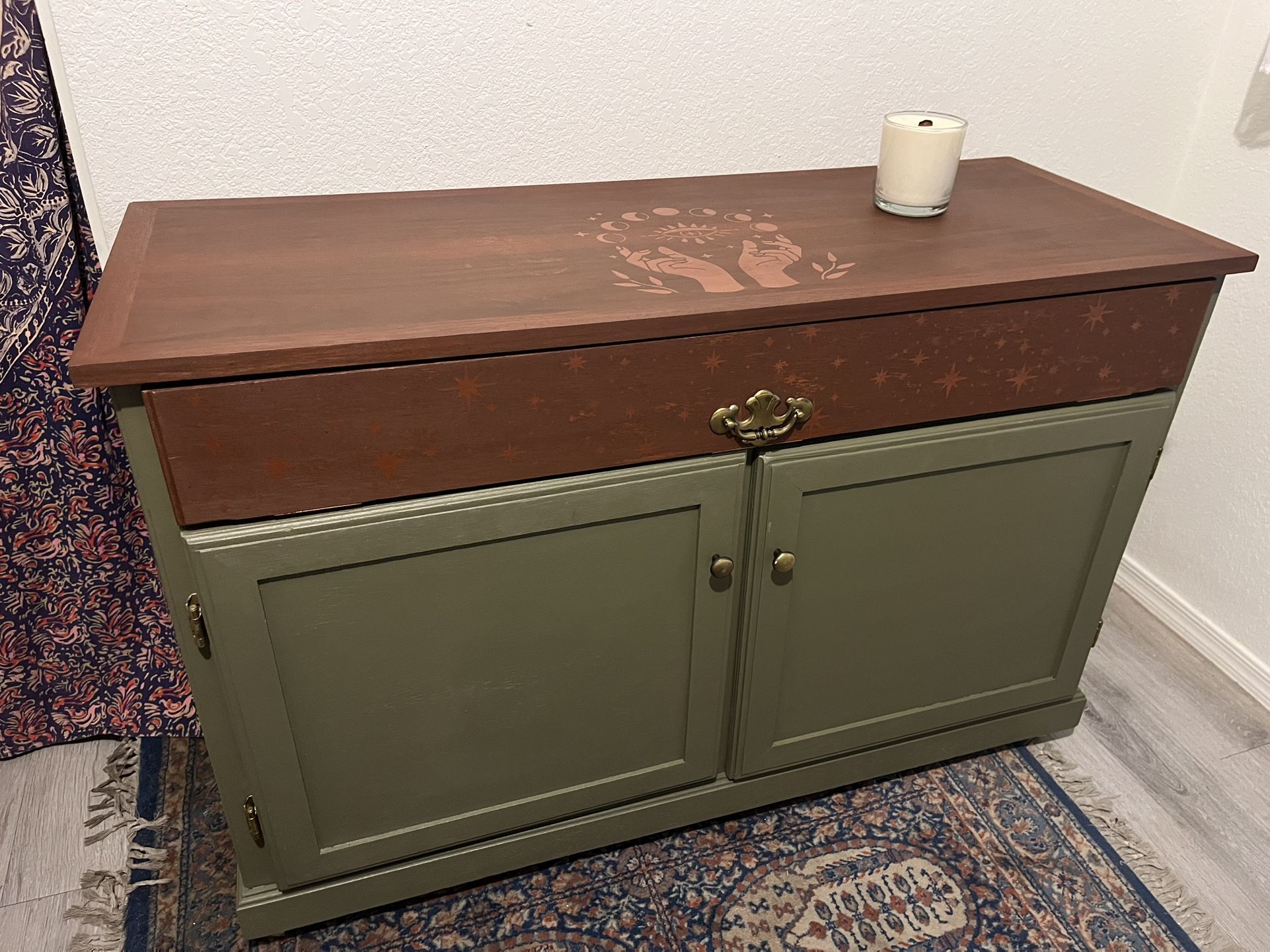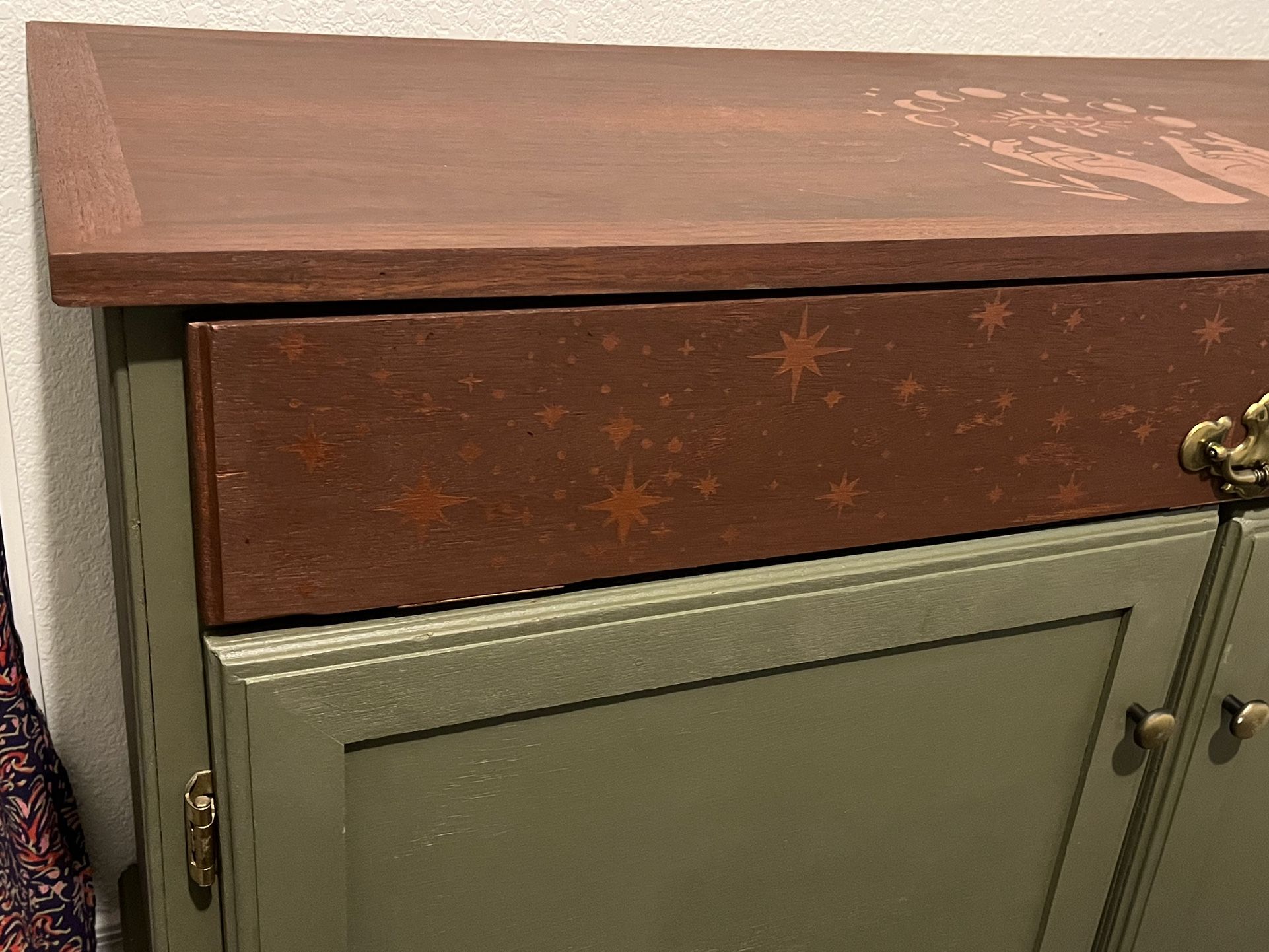 Unique vintage credenza refinished with a unique moon and stars theme. Freshly painted , sanded and stained.