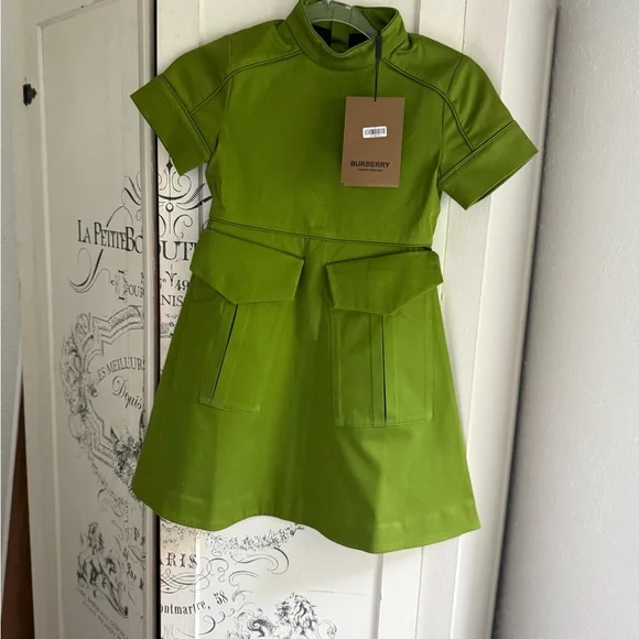 This is a NWT Guaranteed Authentic Elegant Burberry Girl’s Green Aline dress with Hand Pockets in pristine condition with all tags attached including the authenticity tag/extra button. There are absolutely no flaws and this is brand new! This beautiful zip back, Aline, Cotton/Elastane, lined, Mock Neck Modern Girl’s Short Sleeve Dress is a modern striking lime green. It is a size 8 in girl’s and retails for $375.00. The length that is should fit is noted on the tag to be 128 CM. Feel free to ask any questions and will ship within 24 hrs!* Price is Significantly discounted and firm please!