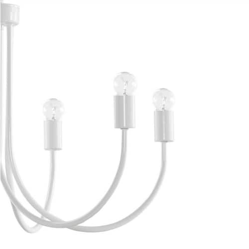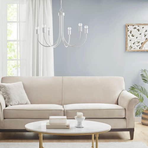 About This Product:The Ellie 6-Light Metal Chandelier brings elegance and simplicity to your space with its curved silhouette and glossy white finish. Designed in a chic transitional style, this farmhouse-inspired fixture provides bright, open lighting with six unshaded bulbs. Perfect for kitchens, dining rooms, or vaulted ceilings, it adds charm and refinement without overpowering the room.