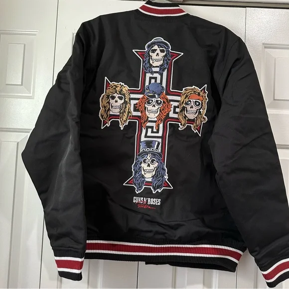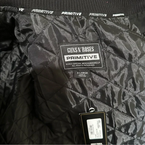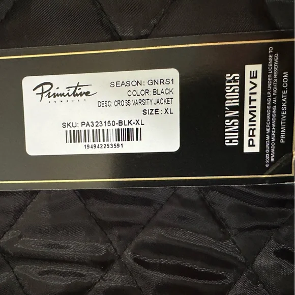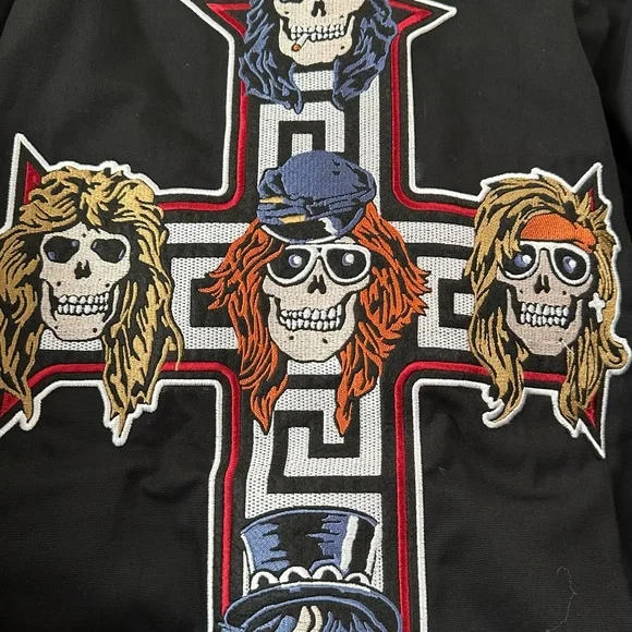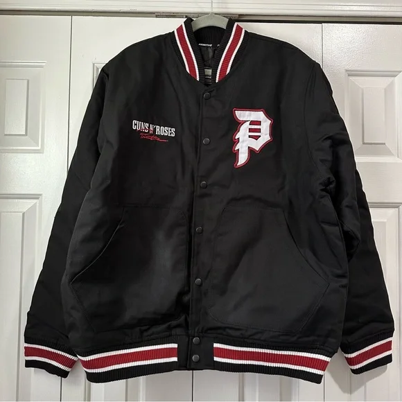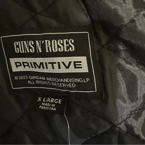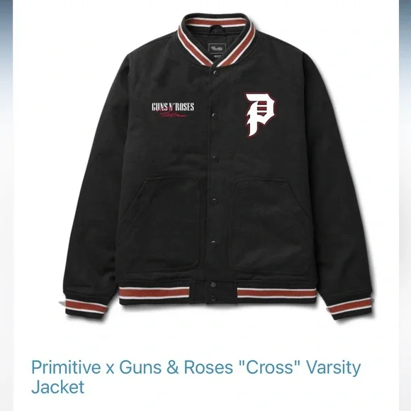 PRIMITIVE x GUNS N´ ROSES Collaboration - Cross Varsity Jacket - Black XL Men´s100% ORIGINAL, LICENSED MERCHANDISE. Limited Edition Collector´s Item!!Main Features:100% durable cotton twill fabric for lasting comfort.High-quality embroidered graphics celebrating the epic collaboration between Primitive and Guns n´ Roses.Versatile varsity jacket design with button closure for a casual yet distinctive look.Optimal cut and fit for moving freely and stylishly.Express Your Unique Style:With the Primitive x Guns n´ Roses Cross varsity jacket, you can add a touch of rock ´n´ roll to your wardrobe. Whether you´re getting ready for a day in the city or an evening out with friends, this jacket will make you feel like the center of attention. The embroidered graphics and authentic design embody a rebellious spirit and a love for music that knows no bounds.