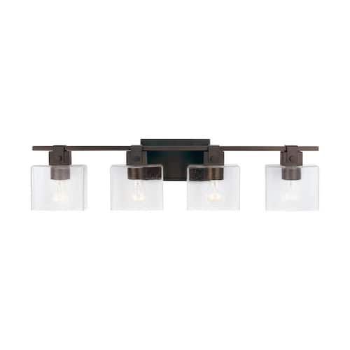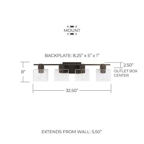 About This Product:The unique rectangular shape of this seeded glass in the Graham 4-Light Vanity is suspended by an equally interesting farmhouse accent inspired by a barn door track. This fixture can be installed facing up or down for multiple application possibilities. Perfect for a master bath or powder room.