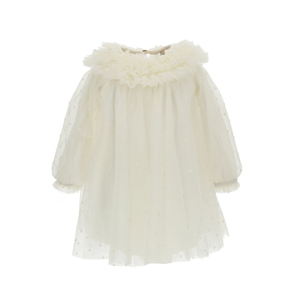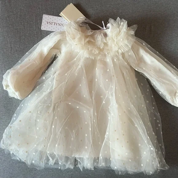 Brand new with tags. The perfect frilly baby girl dress for 1st birthday party, christening, baptism, Christmas dress*color is cream/off-white*- multilayered flock tulle- cotton muslin lining- rounds of ruffles at the collar- blouse sleeves with cuffs