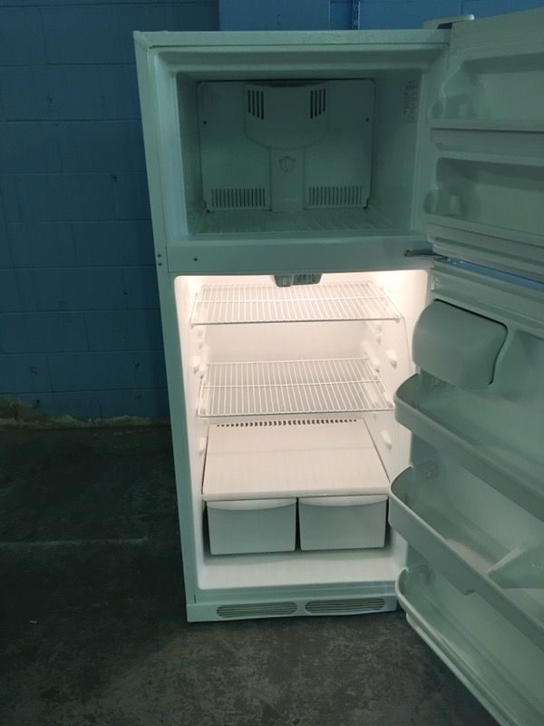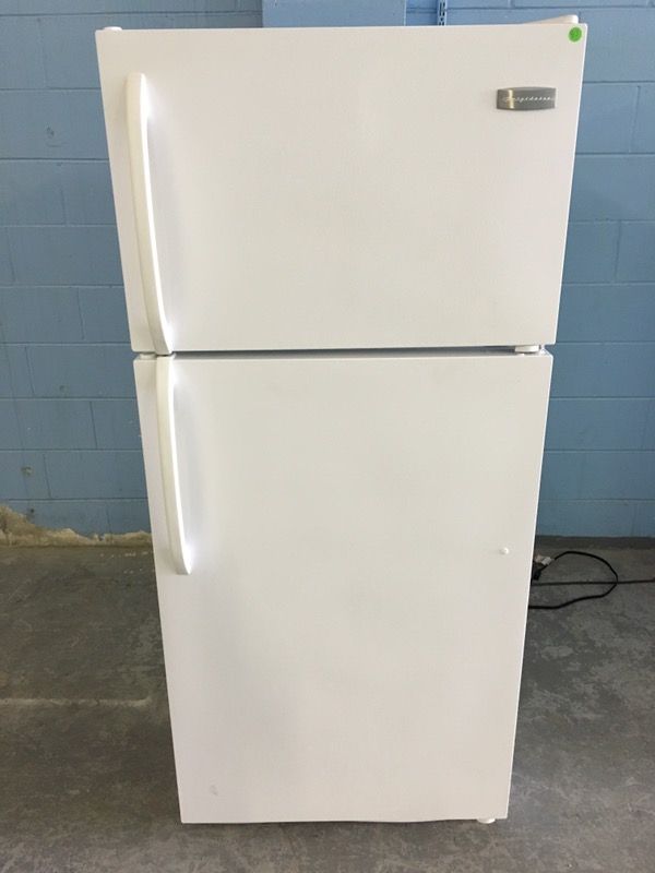 White Frigidaire 17 cubic foot refrigerator for sale. Food section has 2 full width adjustable wire shelves 1 solid plastic shelf 2 crispers and fixed gallon size door shelves. Large freezer with temperature control and 2 door shelves. Comes with 120 day warranty.