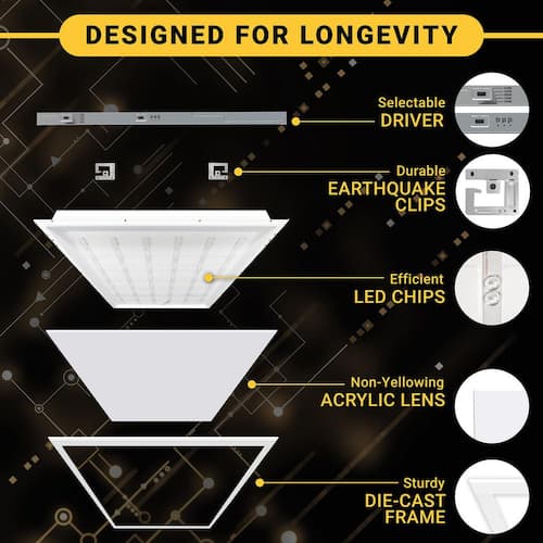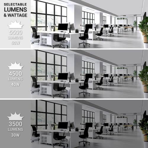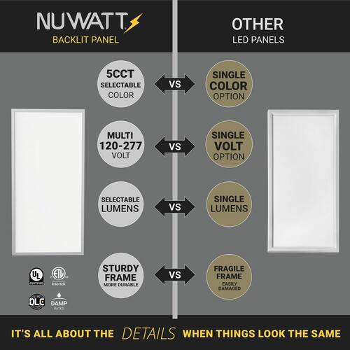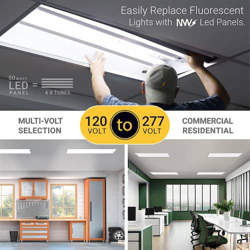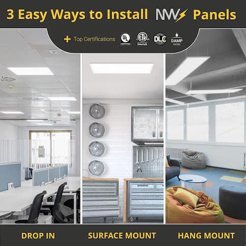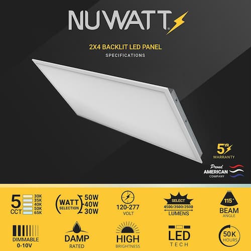 About This Product:Introducing the NuWatt 4 Pack 2x4 LED Panel for Drop-In Ceiling - your ultimate solution for superior illumination and energy efficiency. With three wattage options of 50W, 40W, and 30W, these panels offer customizable brightness to suit any environment. This panel is truly personalized with a 3 Lumen Select feature: choose from 3300LM, 4400LM, and 5500LM. Decide from 3 Color Temperatures 3500K, 4000K, and 5000K to create the ideal ambiance for your space. These LED Ceiling 2x4 Panels are engineered to work seamlessly across a broad voltage range, from 120V to 277V. This makes them suitable for a wide range of applications and simplifies installation. Perfect for a 2x4 LED Panel 220v project up to 277V. Adjust the brightness to your preference with a 0-10V dimmer. These panels are UL-listed, ensuring compliance with rigorous safety standards, and DLC Certified, indicating their performance. Installing these panels is a breeze. They are designed to fit perfectly into standard 2x4 drop ceiling grids, making retrofitting or upgrading your existing lighting a hassle-free process. Constructed with high-quality materials such as Iron and an acrylic non-yellowing lens these LED 2x4 LED Panel Lights are built to last. They have a long operational lifespan of up to 50,000, which reduces the need for frequent replacements and maintenance NuWatt, Lighting Your World.