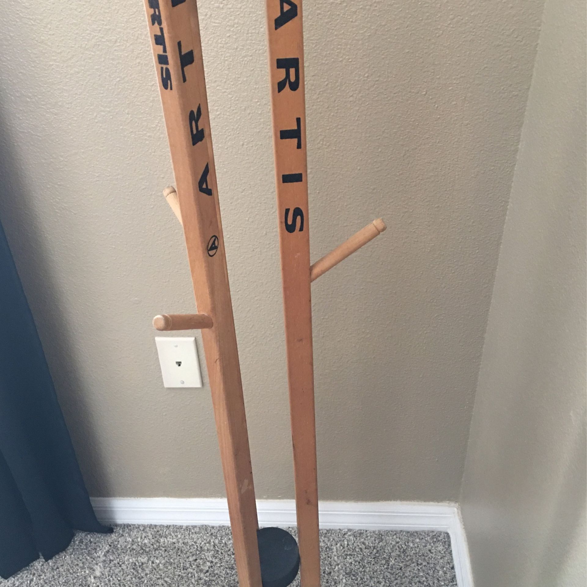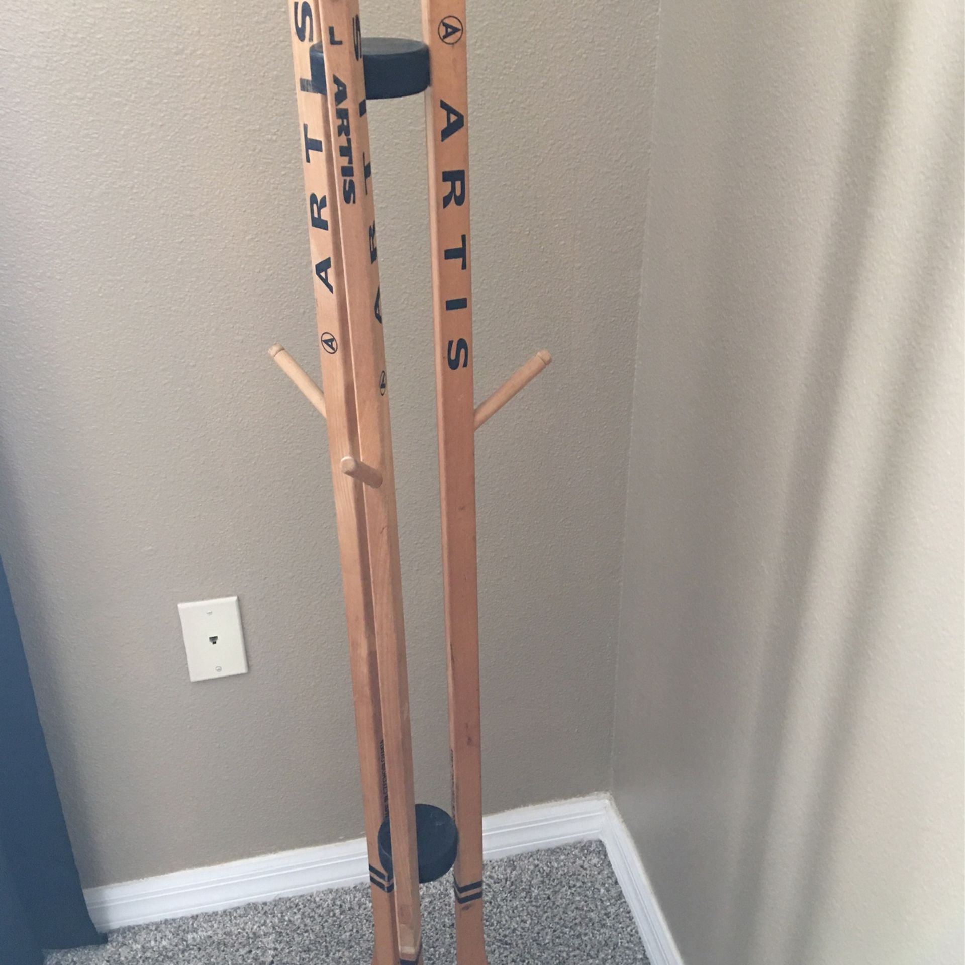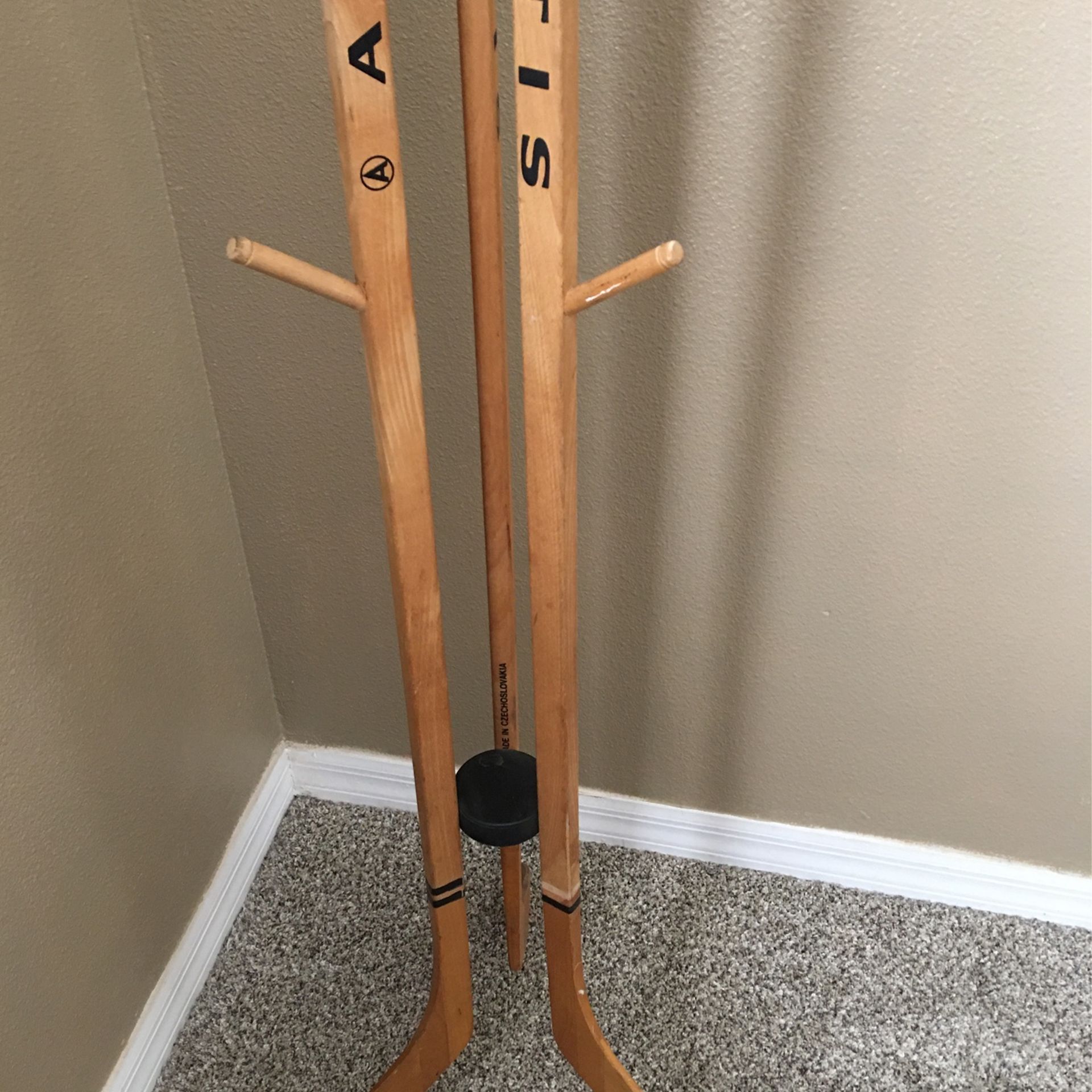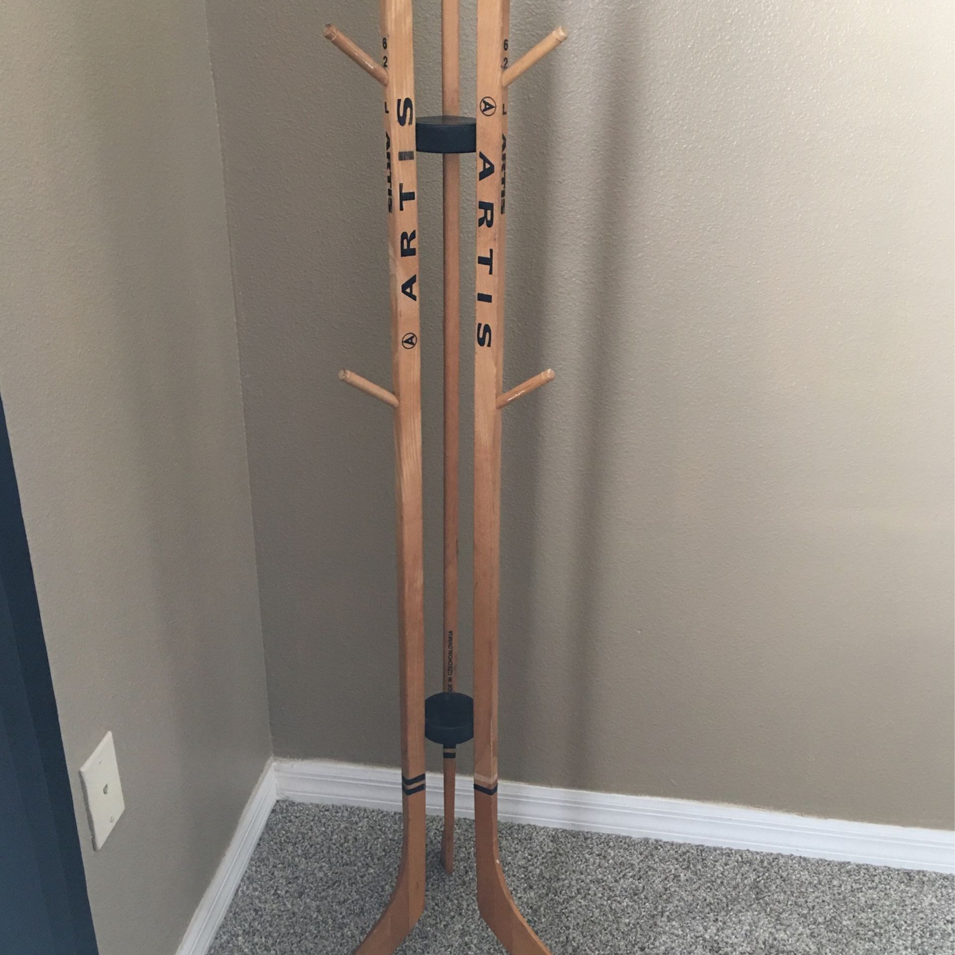 This is a unique, vintage coat/clothes rack made of wood hockey sticks. Artis brand, made in Czechoslovakia 1980’s. Great item for the sports/hockey collector!