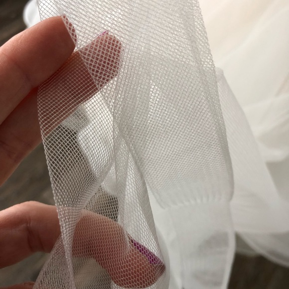 Beautiful Cinderella Couture flower girl dress, champagne color. Gorgeous flower girl dress, beautiful tulle and lace embroidered top with 3/4 sleeves. Beautiful brooch attached to the ribbon at waist, v shaped back with detachable bow. Multiple layers of lining. Dress is brand new, has no tag, was used for photo shoot only, it’s truly stunning. Back of the dress bottom tulle ruffle, the hem came apart, it came like that from the store. You can’t see it at all.
