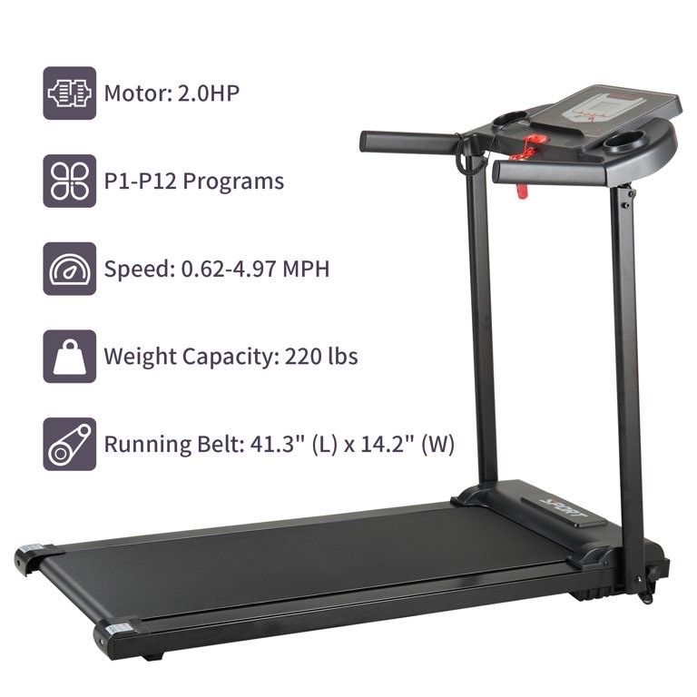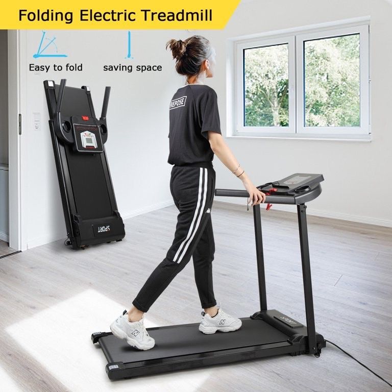 IN BOX! Sells new online for $240. This Jaxpety treadmill is a perfect machine for daily workout. Passed the accreditation of EMC, EN957, CE, ROSH. 12+ programs, 3 Countdown Modes, fits all your family. Real Space Saver, Convenient Design. This LCD display folding treadmill carry newest functions, such as MP3 player, LCD display console and safety key for emergency. Folding design for home use could save space and move. With this treadmill, your home becomes an ideal gym for you to stay in shape. Specifications: Color: Black Material: ABS + Steel + EVA Overall Dimension: 51.19" (L) X 22.44" (W) X 42.13" (H) Folding Dimension: 50.01" (L) X 22.44" (W) X 7.48" (H) Running Belt Dimension: 41.34" (L) X 15.08" (W) Speed Range: 0.6-5.0mph (1-8 km/h) Net Weight: 55.37 lbs Maximum Weight Capacity: 220 lbsCertification: EMC/EN957/CE/ROSH certificatedSafety Emergency Key: connecting with treadmill, offering extra protectionFolding & Space-Saving Design: easily folded and placed, reducing the floor space Phone/Pad Holder: much convenience for putting your mobile phone or pad on the holder 12 Preset Training Plans: specially programmed 12 preset training plans for different settingPowerful and Noiseless Motor: 2.0HP powerful and noiseless motor, no worry to bother othersMulti-functional LED Display: tracks your performance in time, calorie, speed, distance and stepShock-Absorbing & Non-slip Running Belt: enough room for use, comfortable workout experiencety91G0276 (ya F)