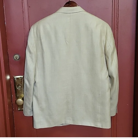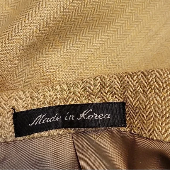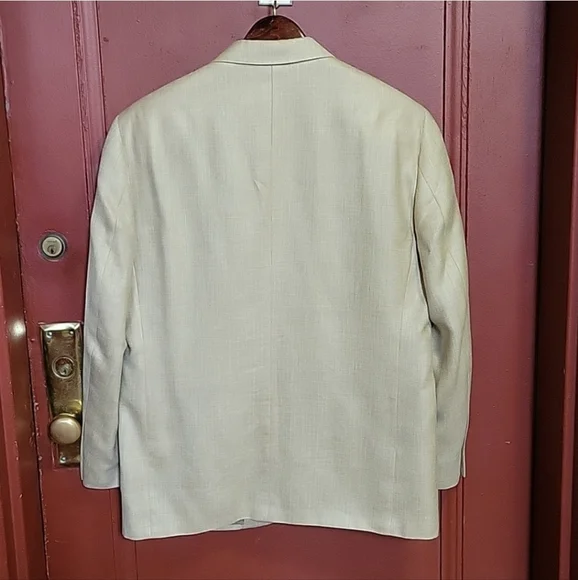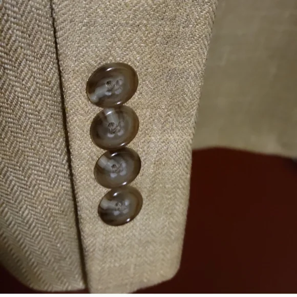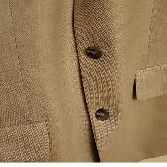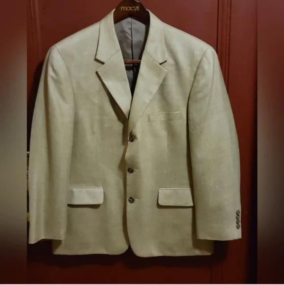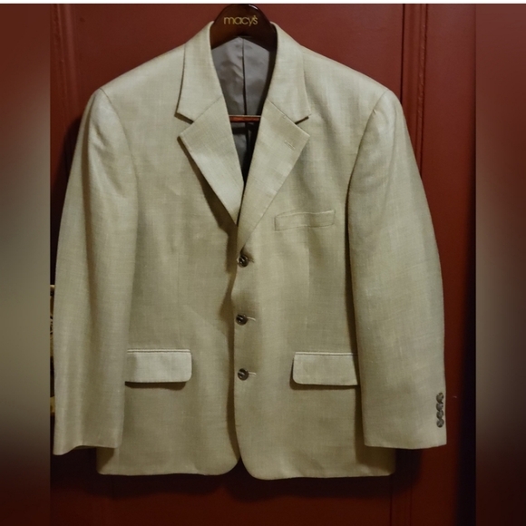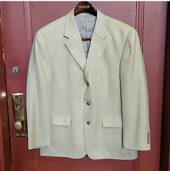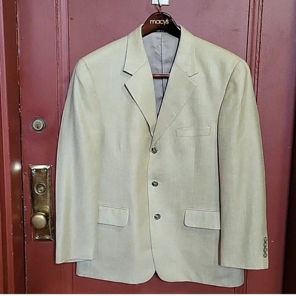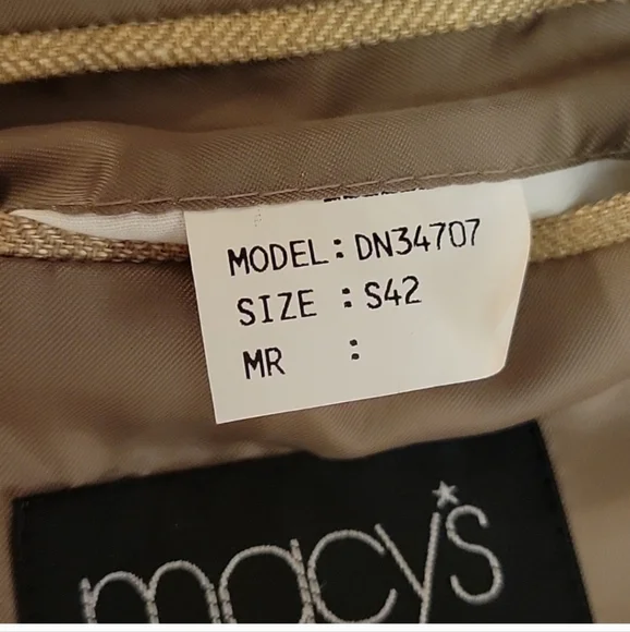 MACY´S MEN´S STORE Model : DN34707 Single Breast Three internal pockets Three front pockets- Two flap covered Three button down closer Longsleeve with four buttons at each hem Measurements: Length 29", sleeve 24", pit 22", shoulder 22". Fabric: Rayon/ Wool/Linen Made in Korea Gently worn-almost newrs