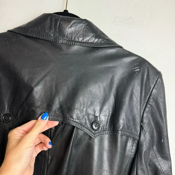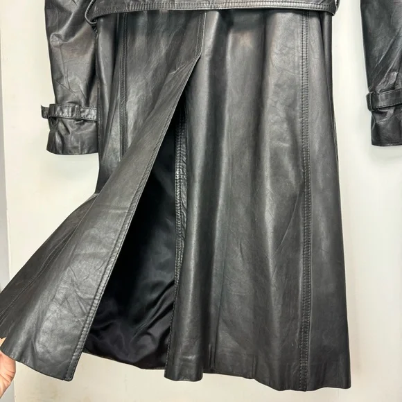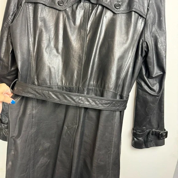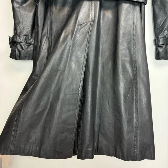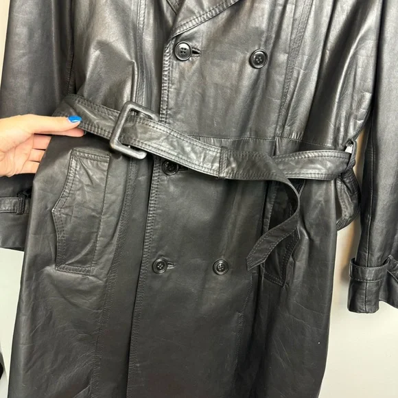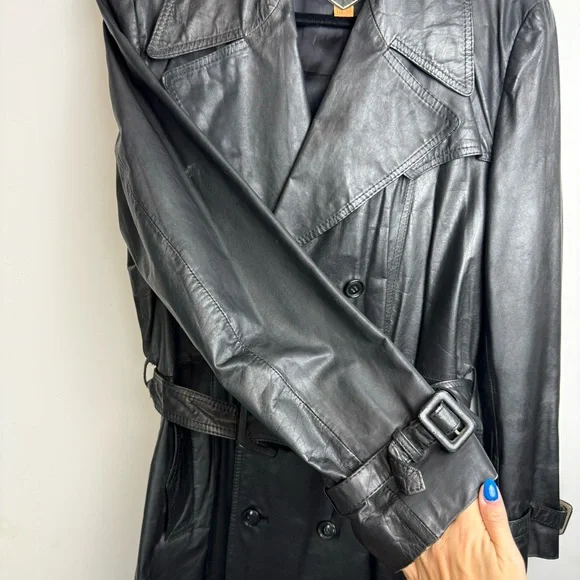 Vintage Leather TrenchSz EU 44Black Genuine LeatherTrench coat jacket Unisex styleAdjustable belted waistDouble breasted buttom closurePreowned sold as isMinor wear shownApprox Measurements Laying Flat Pit to pit- 20.5”Length- 43”