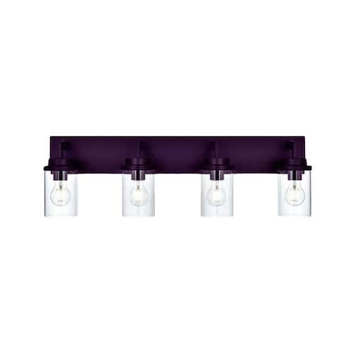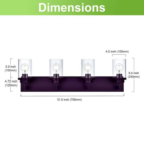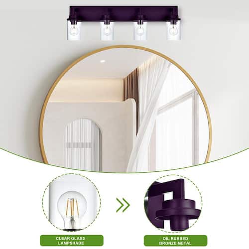 About This Product:This 4 Light Bathroom Vanity Light features a minimalist design and modern style to add a touch of luxury to your space. Our quality fixtures are corrosion, moisture and oxidation resistant. Featuring a sturdy and durable metal rectangular backplate (oil rubbed bronze finish) and a clear cylindrical glass shade for a classic and elegant look. Please note: Bulbs are not included with this product.