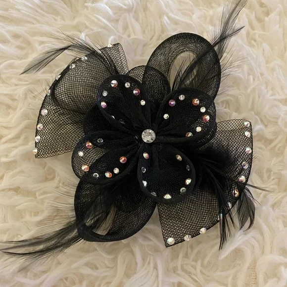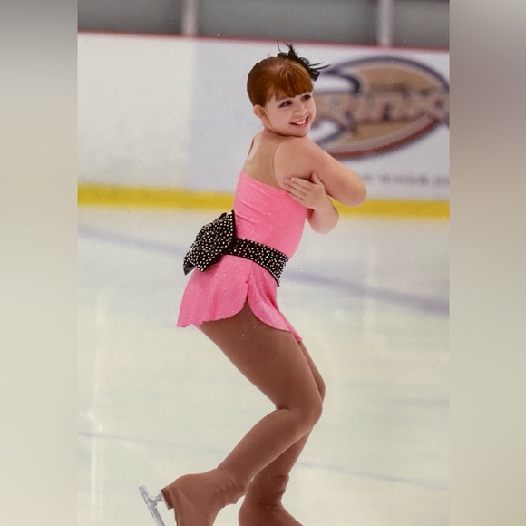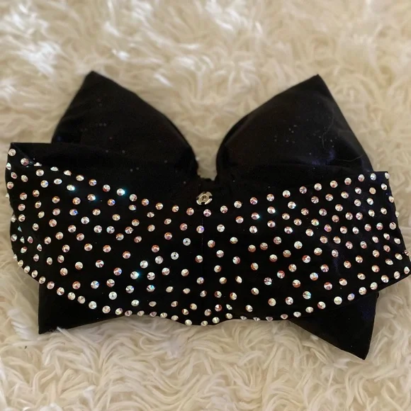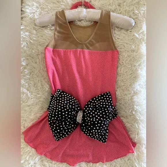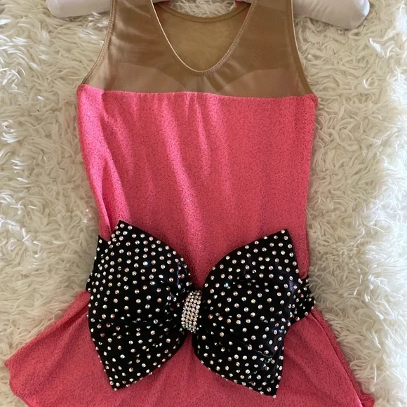 Hot pink dress with black sash/belt and 1500+ genuine swarovski crystals!!! Bow is a definite standout !!! Hair accent piece included.