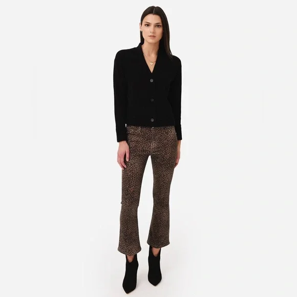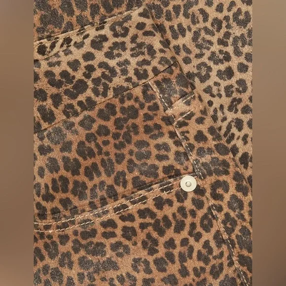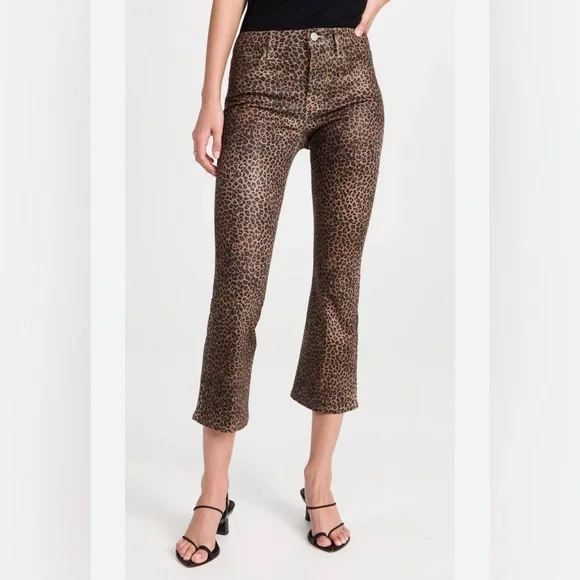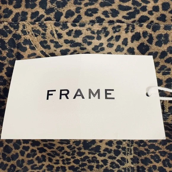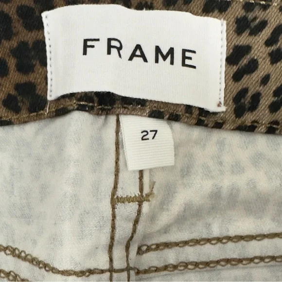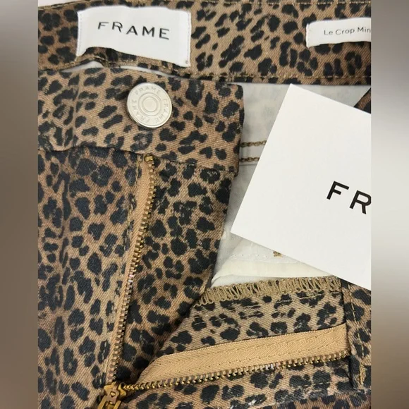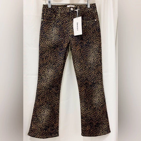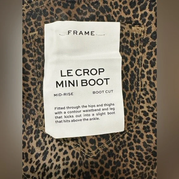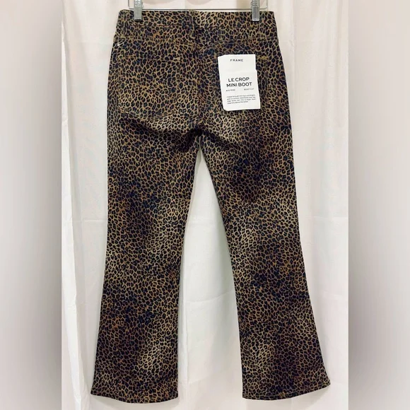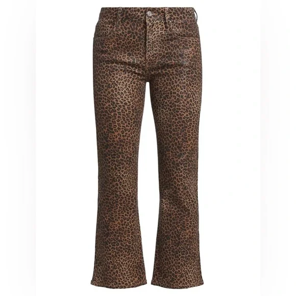 Frame Womens Le Crop Mini Mid-rise Coated Bootcut JeansColor - Leopard Print Size -27A BEST-SELLING SILHOUETTE WITH A CROPPED BOOT-CUT LEG. DESIGNED WITH A COMFORTABLE CONTOUR WAISTBAND, THIS JEAN IS FORM-FITTING AT THE HIP AND TAPERS OUT FROM THE KNEE.Fitted through the hips and thighs with a contour waistband and leg that kicks out into a slight boot that hits above the ankle.Manufacturer: FRAMESuggested Price: $265.00Condition: New with tagsStyle Type: Boot CutCollection: FRAMESleeve Length:Closure: Zipper with top button Material: 92% Cotton/6% Polyester/2% ElastaneFabric Type: DenimSpecialty: CoatedWaist - 27”Inseam - 26”Rise - 10”New with tags !