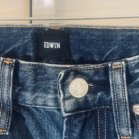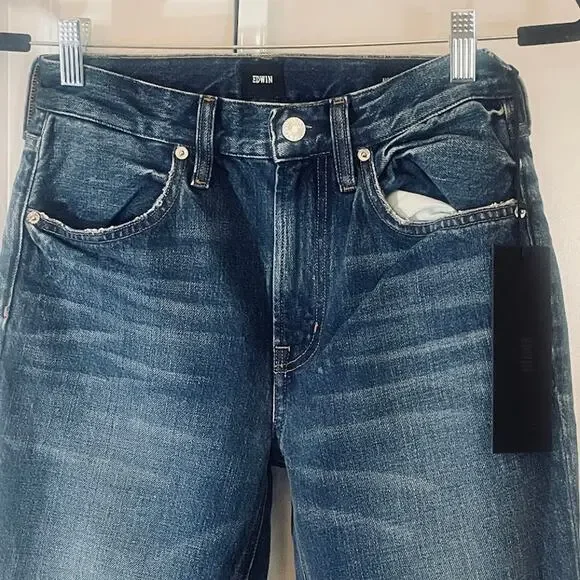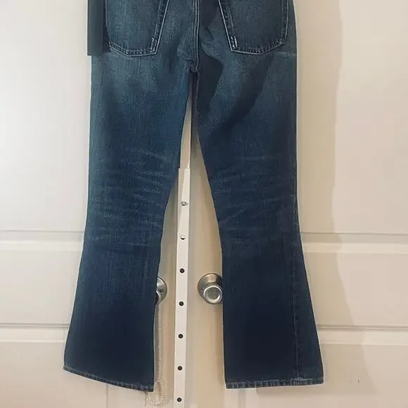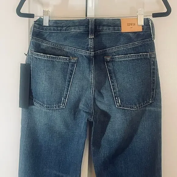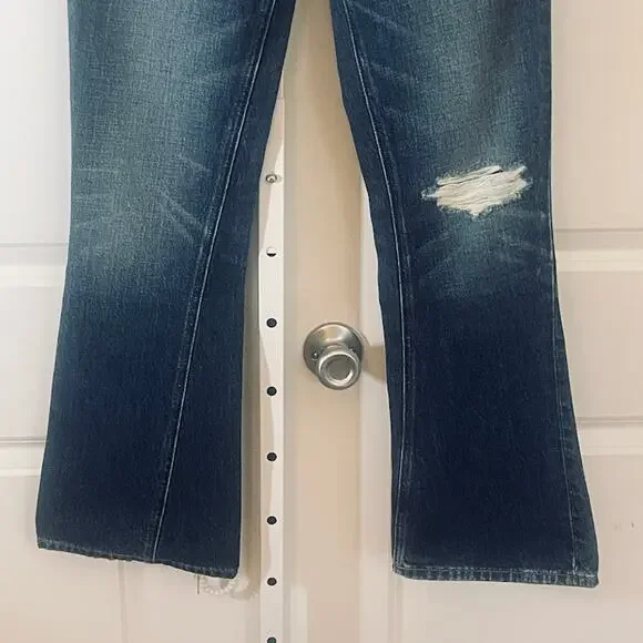 NWT Edwin Averi Flare Jeans - Women Size 25 - Blue- Flares- 100% Cotton- Distressed- 5-Pocket style- Leather Brand Tag on back- Waist: 13", Rise: 10", Inseam: 29"- Medium wash- Sold at Anthropologie- Edwin, Edwin denim, Edwin jeans, flare jeans, flares, denim