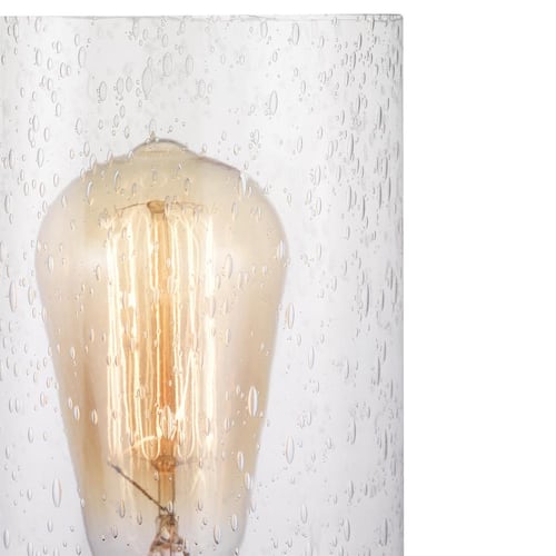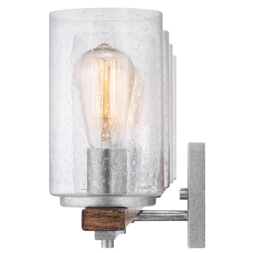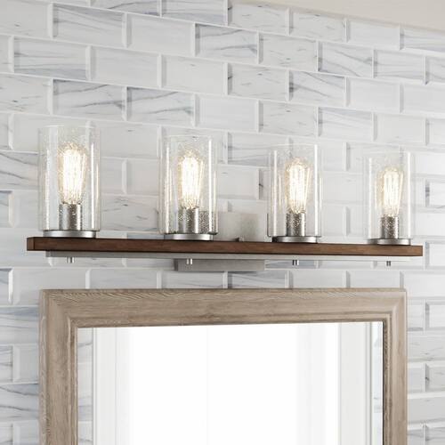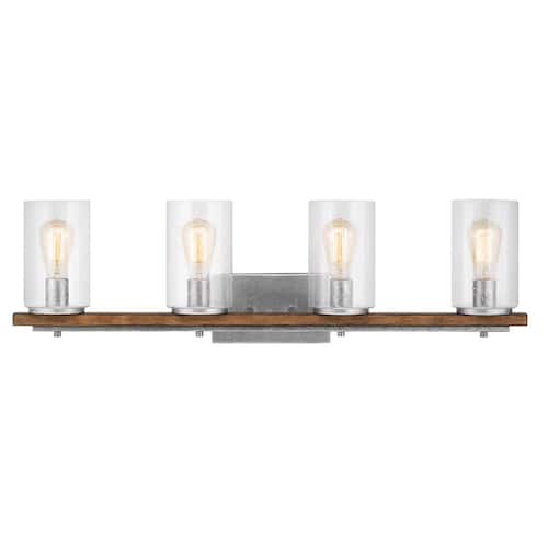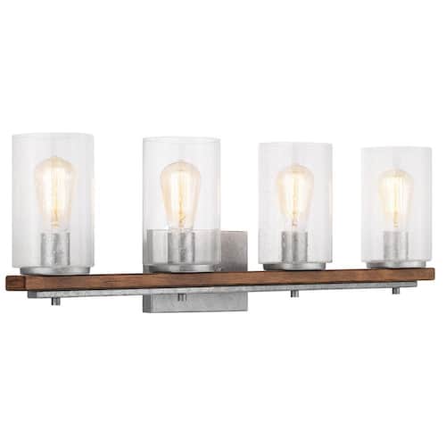 About This Product:Enhance your home with this Hampton Bay Boswell Quarter four-light vanity light. A galvanized finish, clear seeded glass shades and painted chestnut wood accents add an elegant style to your space. For convenience, this damp-rated, dimmable fixture comes with installation hardware to mount it up or down.