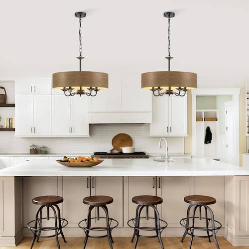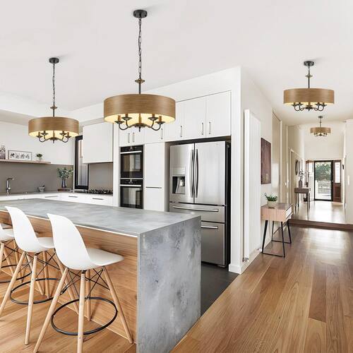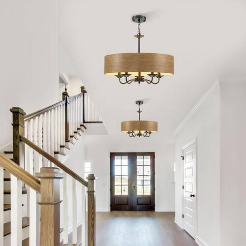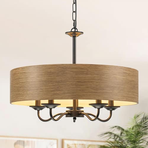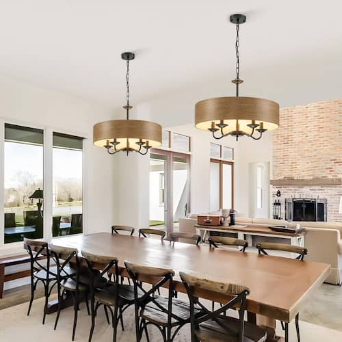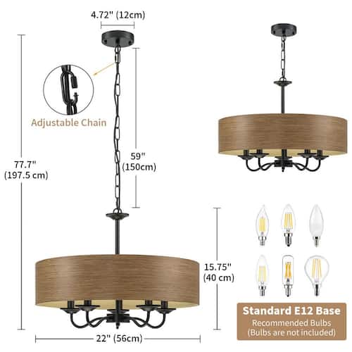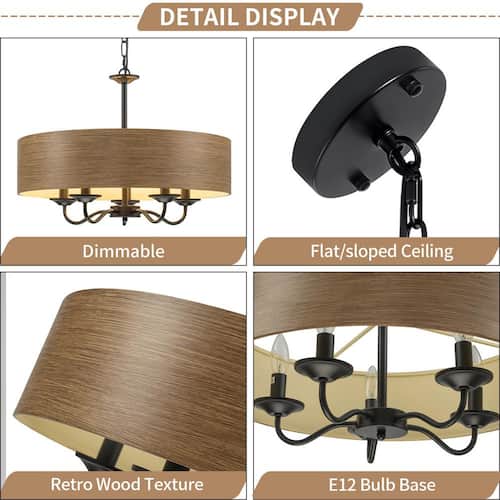 About This Product:This chandelier is a perfect blend of rustic charm and modern elegance. It features a drum lampshade crafted from wood grain metal material, exuding a warm and natural aesthetic that can effortlessly complement various interior styles, from farmhouse to contemporary. Suspended from the ceiling via a robust black chain, it combines industrial elements with classic charm. When illuminated, the chandelier casts a soft, ambient glow, making it an ideal lighting solution for various interior spaces.
