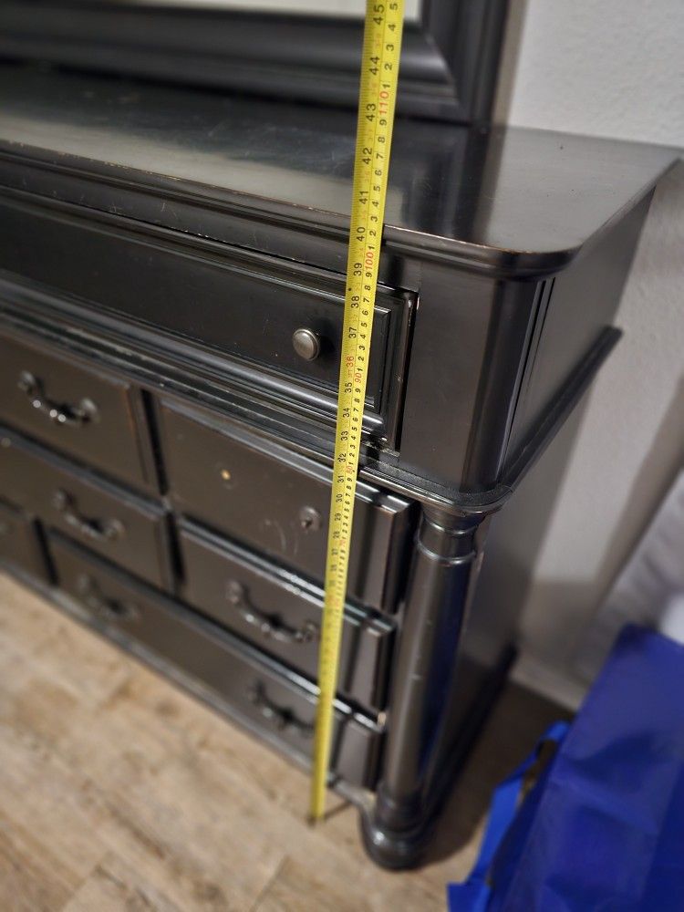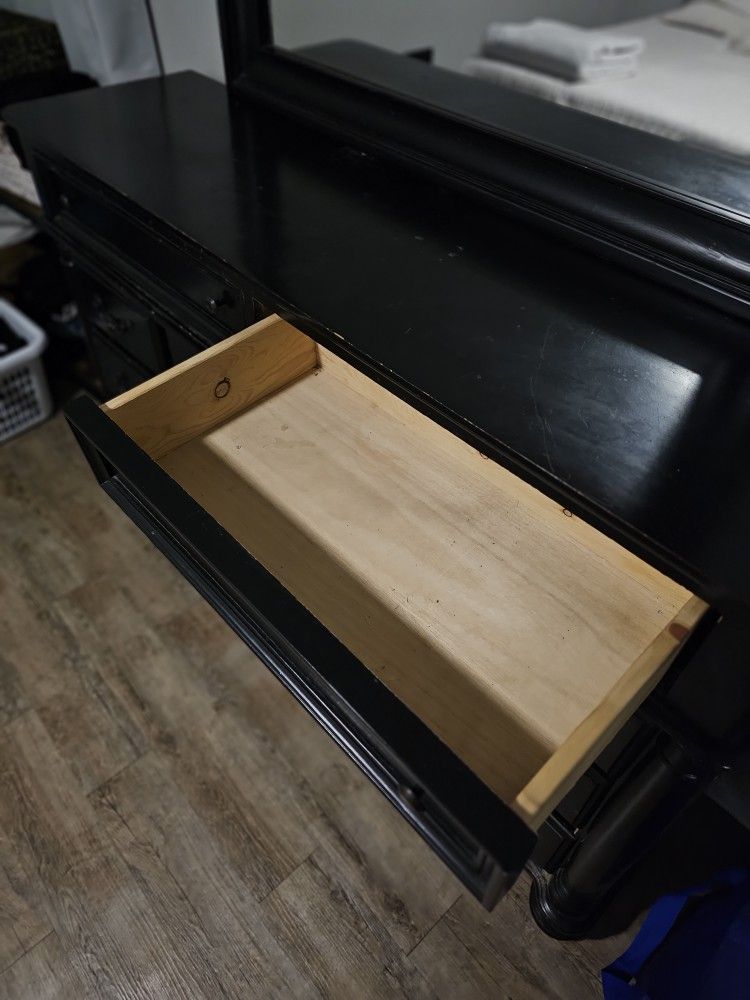 This dresser we are selling needs a little bit of work. Some of the drawers are loose and missing handles. We posted the measurements in the photos for reference. Mirror does bolt on and off for transport. Non smoking house.