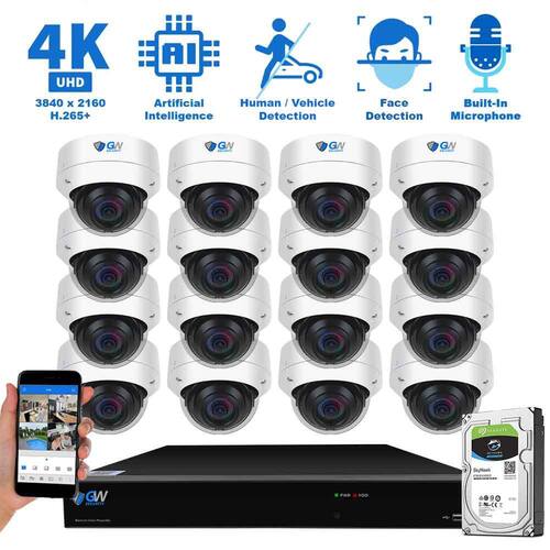 About This Product:8533MIC16-4T is our reliable 16-Channel Security Camera System with unmatched video quality, perfect for any home and business with the need to protect valuable possessions. This ultimate HD security package comes with 16 x 8MP IP Dome cameras, an NVR with a built-in 4TB security-grade hard drive that can store up to 400-hours of video surveillance and can also be upgraded to an astronomical 24TB hard drive capacity for even more hours. 4K video has 400% more pixels per frame than standard 1080P (2MP) HD. 8-Megapixels boast 3840 x 2160 resolution, additional pixels make the digital zoom more effective, providing more details at close distances or the ability to digitally zoom in on details at a greater distance than before. Our high-performance recorder uses H.265 compression, H.265 is faster and consumes 50% less data allowing you to store more video to your NVR while also preserving and improving upon superior video quality. The Power over Ethernet setup is clean and simple with a single network cable, built-in P2P service, and support of ONVIF protocol. 100% True Plug-and-Play - An additional built-in network interface provides a unique IP address to each security camera, eliminating the hassle of messy IP security camera configurations.