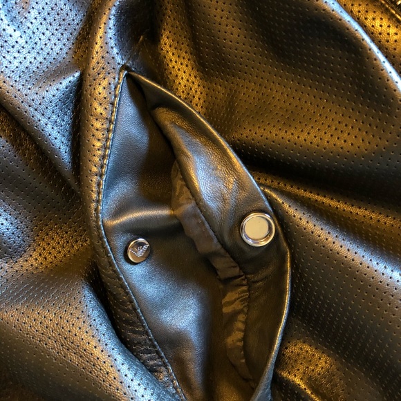 Leather bomber jacket size large 56. Very soft perforated leather. This is a light jacket but can be layered for more warmth. There is some small tearing on the sleeve ( see pics) also one of the buttons on the picket has come off, can easily be fixed by a seamstress. This is a great jacket that I bought for $800 from the Armani store in Prague. I hate to get rid of it but I’ve got about 8 leather jacketsThe first pic is not the actual jacket but very similar in style.