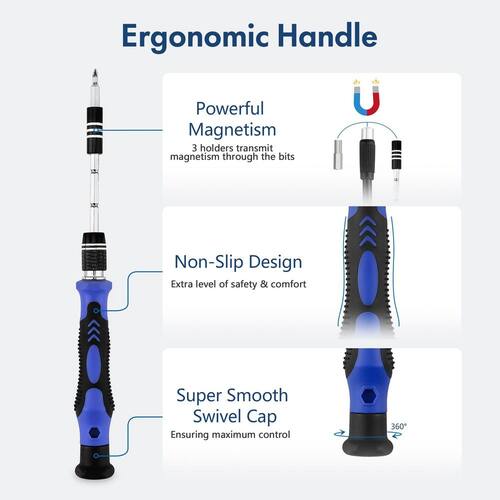 About This Product:This 140-in-1 precision screwdriver set combines functionality and user-centric design for electronics repairs. The kit includes 120 interchangeable bits and 20 accessories like anti-static tweezers, suction cups, and magnetic tools to streamline tasks from battery replacement to internal cleaning. Its ergonomic handle features a swivel top and textured grip for fatigue-free precision, while magnetic enhancements-a bit holder, organizing pad, and adjustable magnetizer-ensure secure handling of tiny screws. The labeled rubber rack and compact Oxford storage case enable quick bit identification and portability. Compatible with smartphones, laptops, cameras, gaming devices, and more, it caters to both professionals and hobbyists tackling repairs across consumer electronics. Durable construction and thoughtful organization minimize downtime, making it ideal for intricate projects requiring reliability and ease of use.