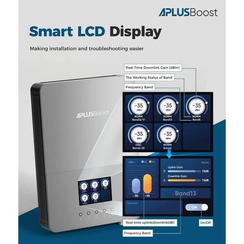 About This Product:Boost your connectivity with this powerful cell phone booster, covering up to 8,000 sq. ft. with its dual indoor antennas and up to 68 dB of gain. Compatible with all major U.S. carriers and multiple frequency bands, it enhances 3G, 4G LTE and 5G signals for improved call quality and data speeds. Equipped with an upgraded outdoor antenna and a real-time HD LCD display, it ensures reliable performance and easy installation for seamless communication throughout your home or office.