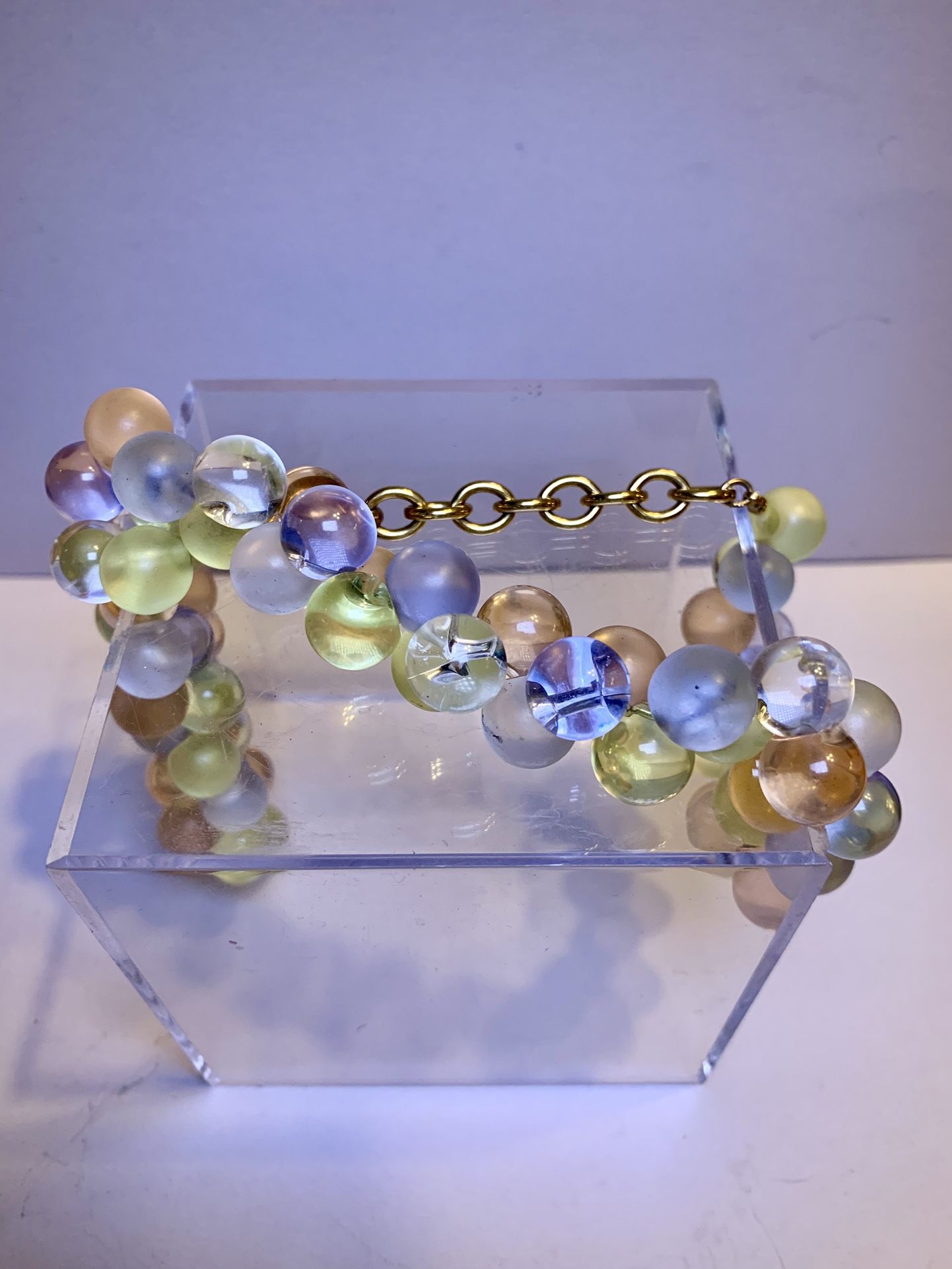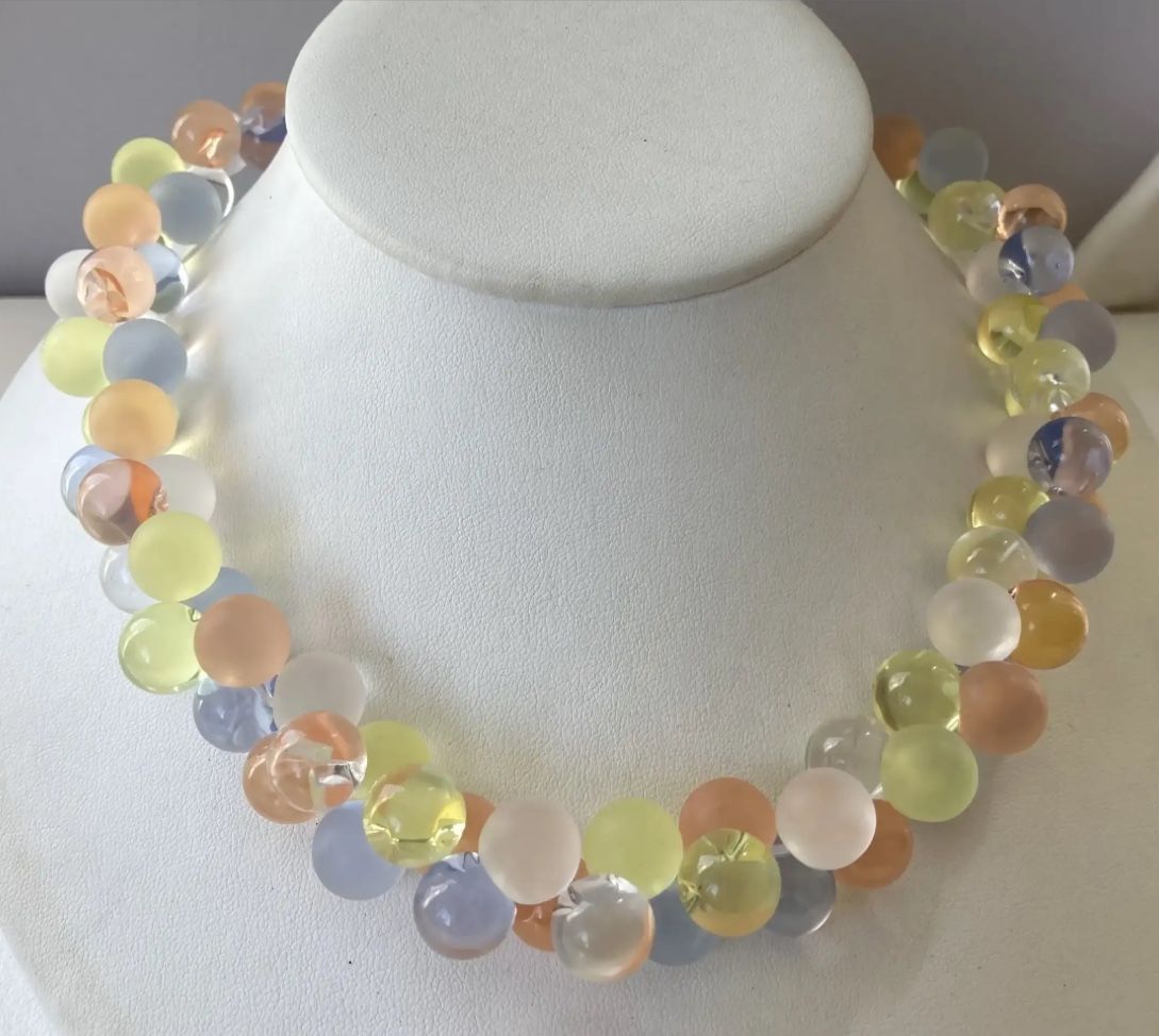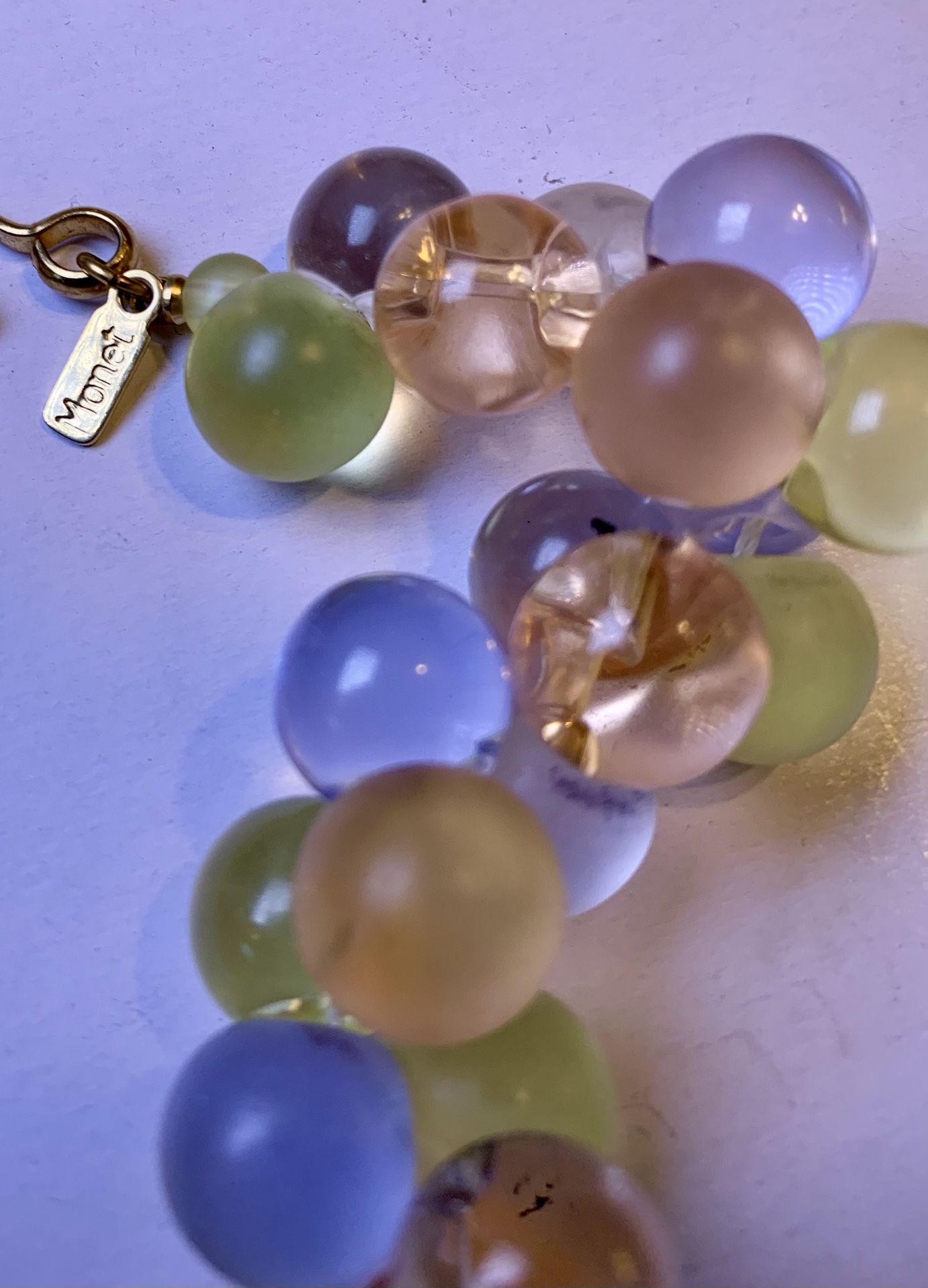 This is a Vintage Monet Wisteria Lucite Pastel Bubble Beaded Runway Designer 18” Necklace/bracelet Hang TagIt is alternating Frosted and Vintage Clear Pastel Bubbles.It’s absolutely gorgeous! My mom loved exquisite jewelry. $80 for pick-up