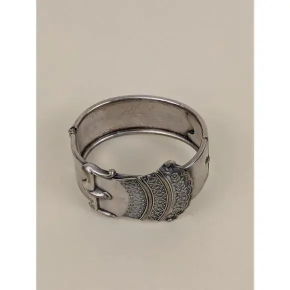 antique Victorian silver buckle motif chunky cuff braceletan incredible relic from the victoria era, a silver plated belt buckle motif cuff bracelet, that fastens on a hinge. it´s got a wonderful patina that seems to pick out the details of the design, along the edges, and tracing parts of the belt buckle. Victorian jewellery is steeped in symbolism, the belt buckle representing the binding of two people together, whether in love or friendship. Not only for romantic love, buckle jewellery was often exchanged between siblings or best friends. In some cases, these pieces were made to honour the enduring memory of a lost loved one. They were often worn stacked in pairs or one adorned on each wrist. They were not only fashionable but carried deep sentimental value. <3PERIOD: 1890´s victorianLength: 7.2´ cuffWidth: cuff 1´, buckle 1.5´MATERIAL: silver platedCONDITION: excellent, wonderful patina