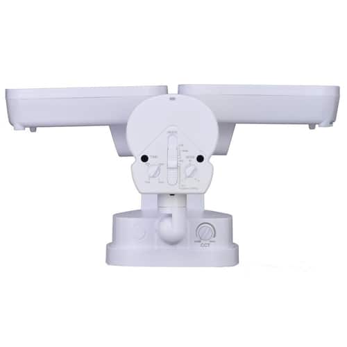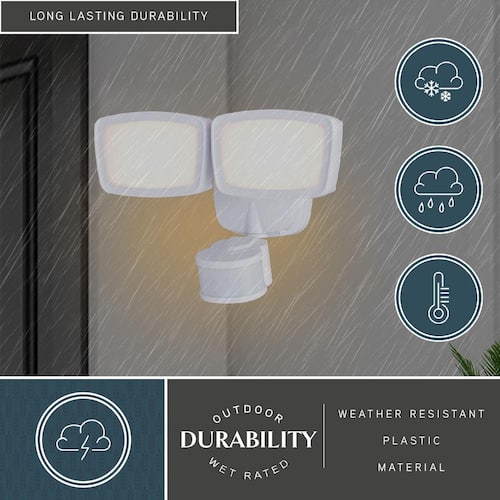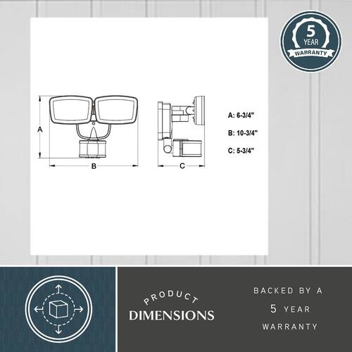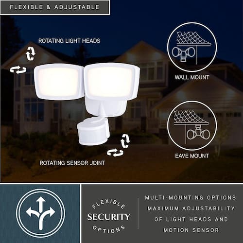 About This Product:This 2-light integrated LED outdoor motion sensor security light provides CCT adjustable low-level 2700K-5000K ambient lighting throughout the night and 100% bright 5000K high level when motion is detected. The light heads and sensor are fully adjustable and deliver 2700 lumens to keep your home´s exterior brighter at dusk, dimmer at night, and instantly bright when motion is detected. Customize your lighting options with 5 modes of operation plus adjustable motion sensor sensitivity. Suitable for wall or eave mounting with a wide detection area of 240 degrees and 85 feet. This Dualux security flood light expands the functionality, safety, and security of your home´s outdoor spaces with bright, reliable light when and where it´s needed.