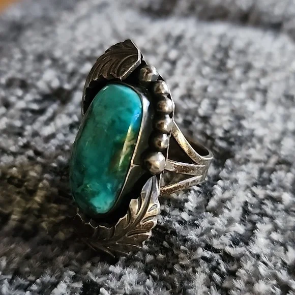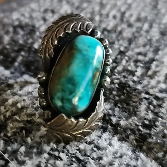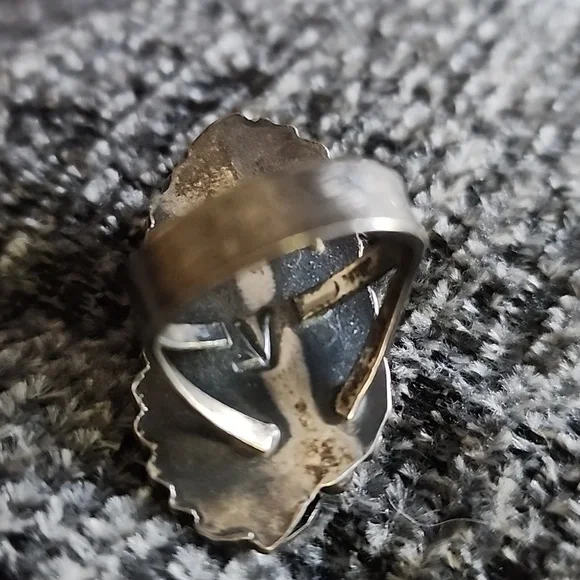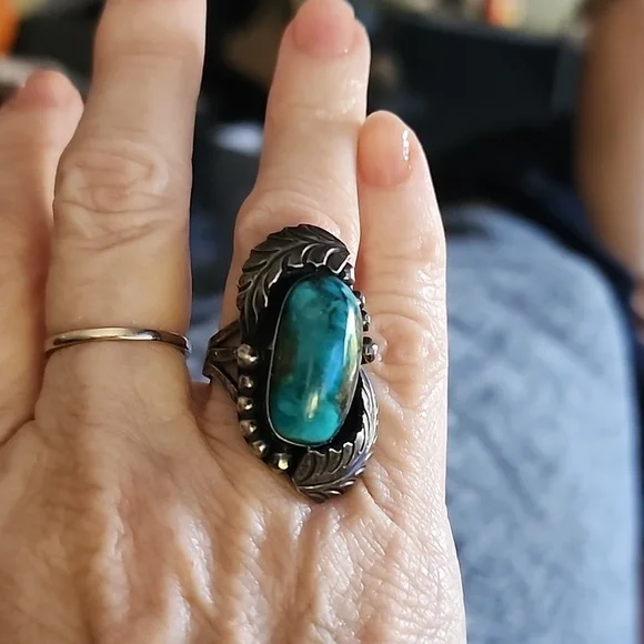 Authentic Indian turquoise ring. I think Navajothis was mu Aunt´s from Mesa Az. she collected and wore alot of Native jewelry. My uncle in the 50s to the 80s did masonry work for many of the Indians in AZ and they paid alot the time with the jewelry because my aunt loved their work.it is stamped in the back looks like a V. I dont have any other history on her jewelry I just several pieces when they both passed.this is beautiful but not my style. large piece of turquoise, lovely feathers.size seems to be a 6& 1/2