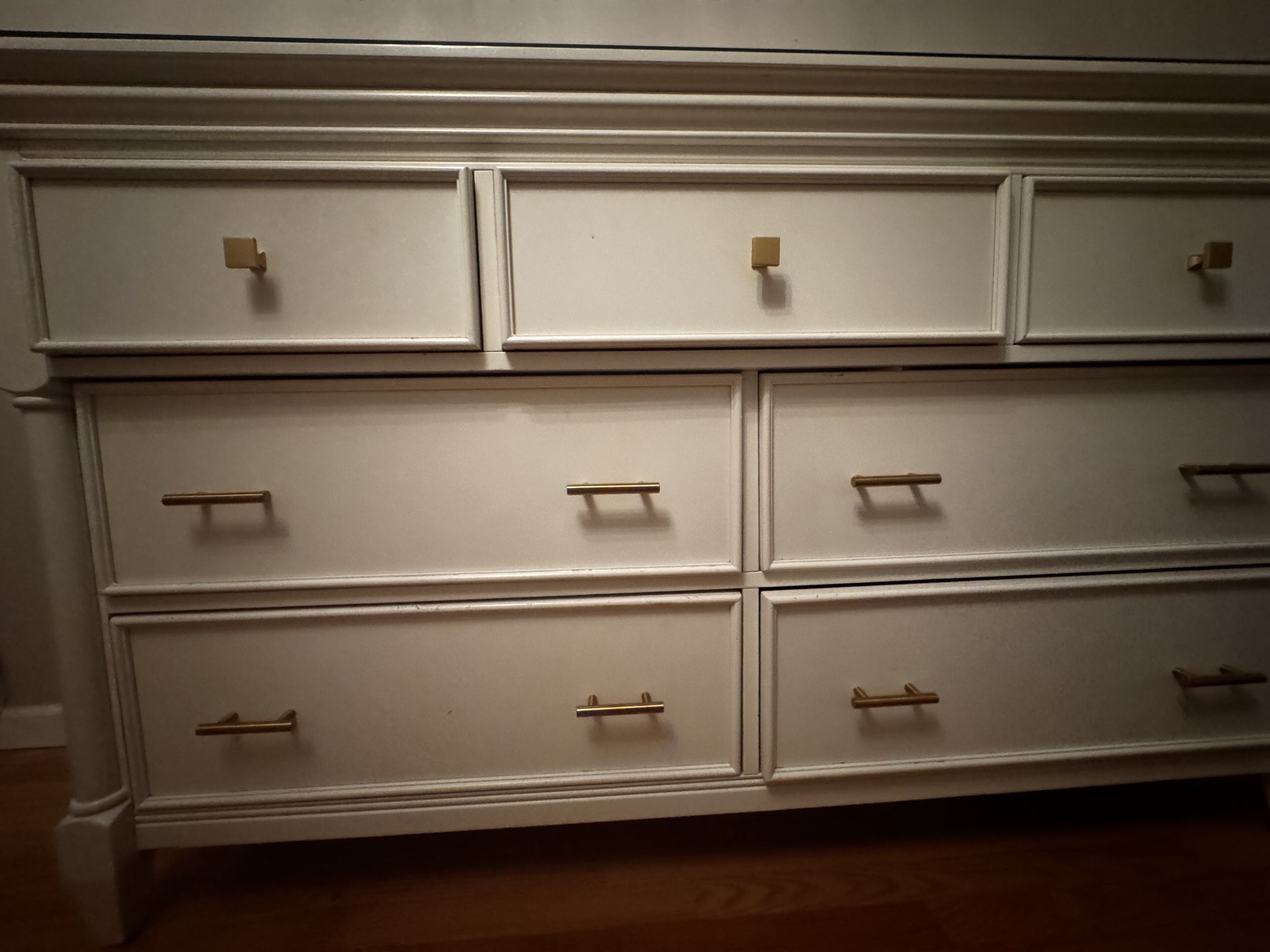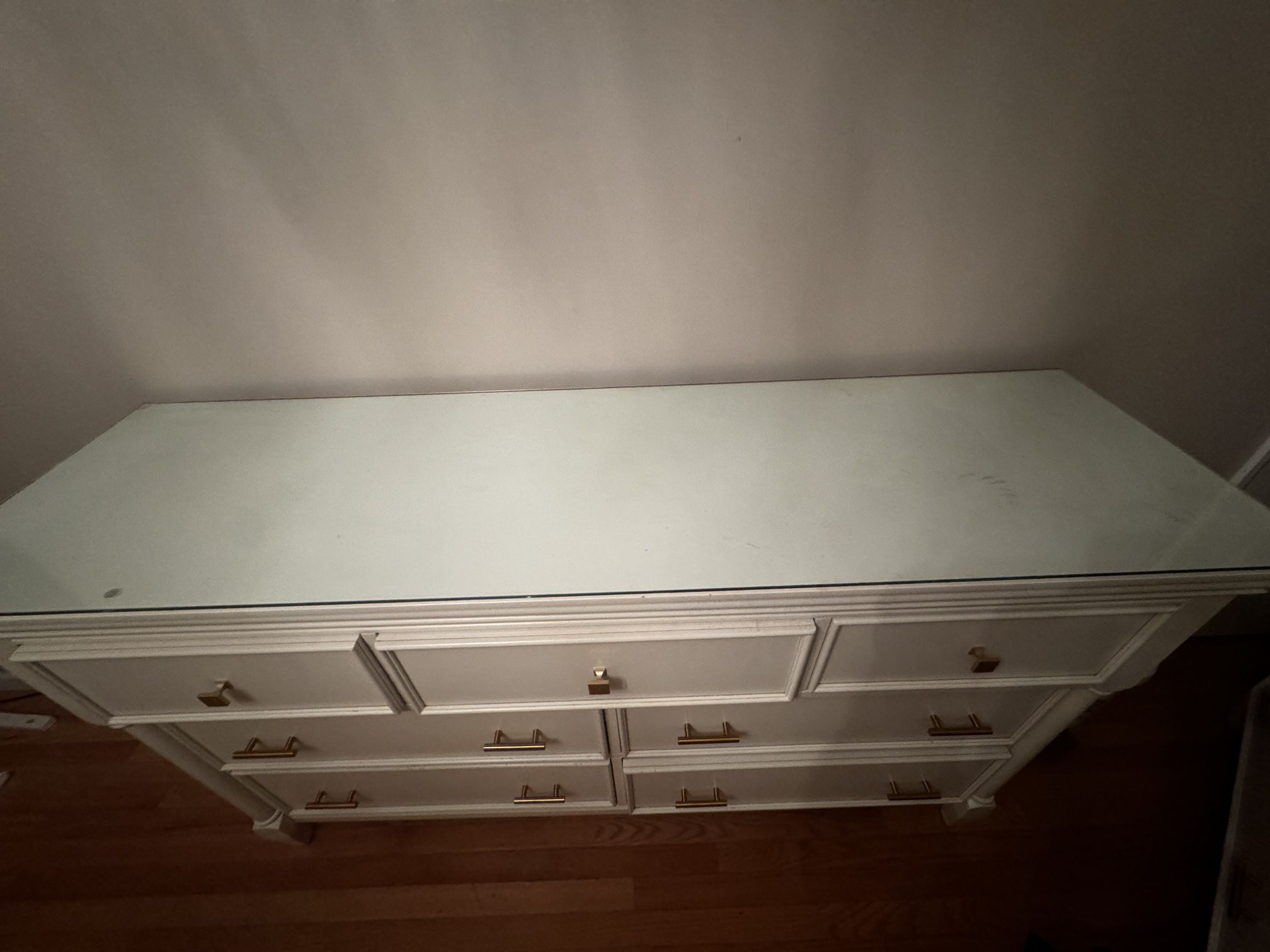 9 drawers Few minor scuffs Glass top (removable ) Comes with gold handles that I put on Original silver handles come with it