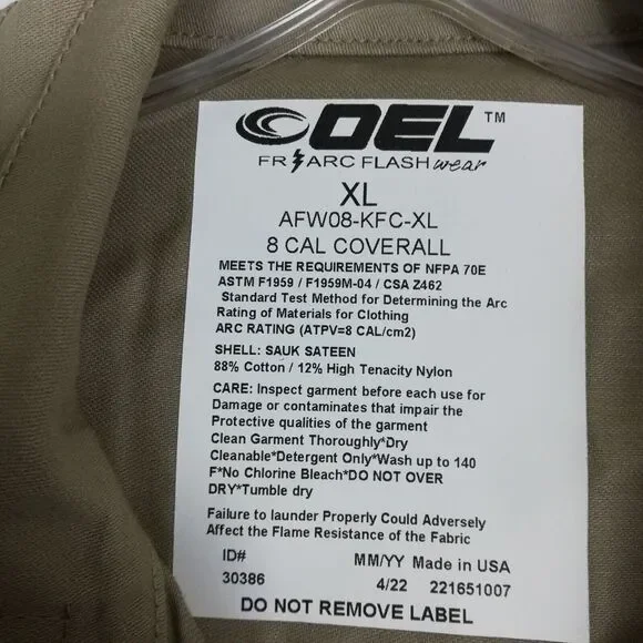 Oel Mens Coveralls 8 Cal/cm2 Arc Flash Khaki AFW08-KFC NFPA 70E XL NewNew with TagsPlease review photos for measurements and condition.Item will be shipped within one business day.We ship items daily Monday-Friday.* Product color may vary slightly due to photographic lighting or your monitor settings.