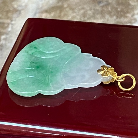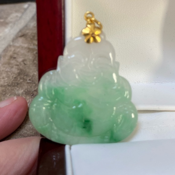 Natural jade pendantJade BuddhaLaughing Buddha Genuine solid 14KT gold baleStamped 585 to signify 14KTGenuine natural jadeNO color enhancementCarved BuddhaExcellent detailBuddha is carved with deep belly laughterHe is signifying much happiness and wealthBackside has carve as well not as detail to indicate a front and a backExcellent coloration Calming greenDelicate translucency in the stoneEach jade piece is unique in coloration and stone patternThis piece is exceptionally beautifulIt has very good translucencyIt encompasses a very deep green colorationGood variation in the coloringBox NOT included