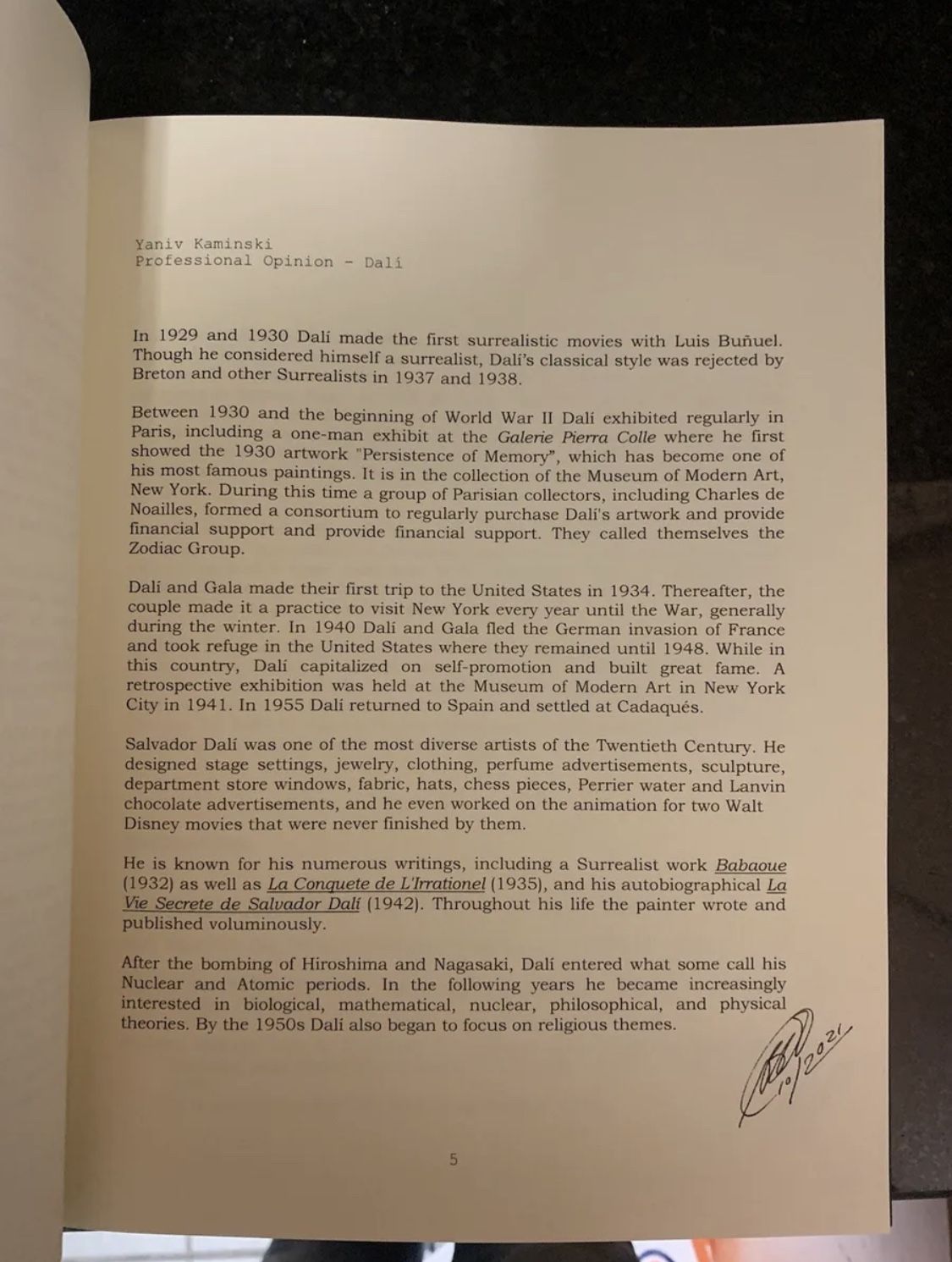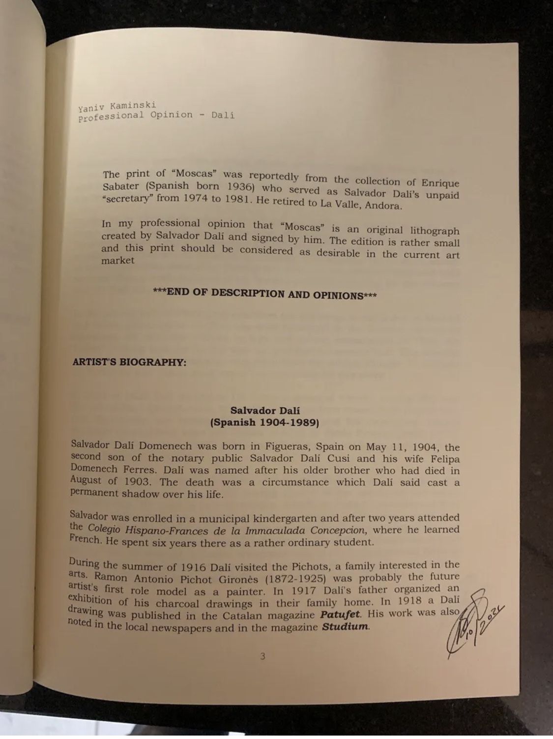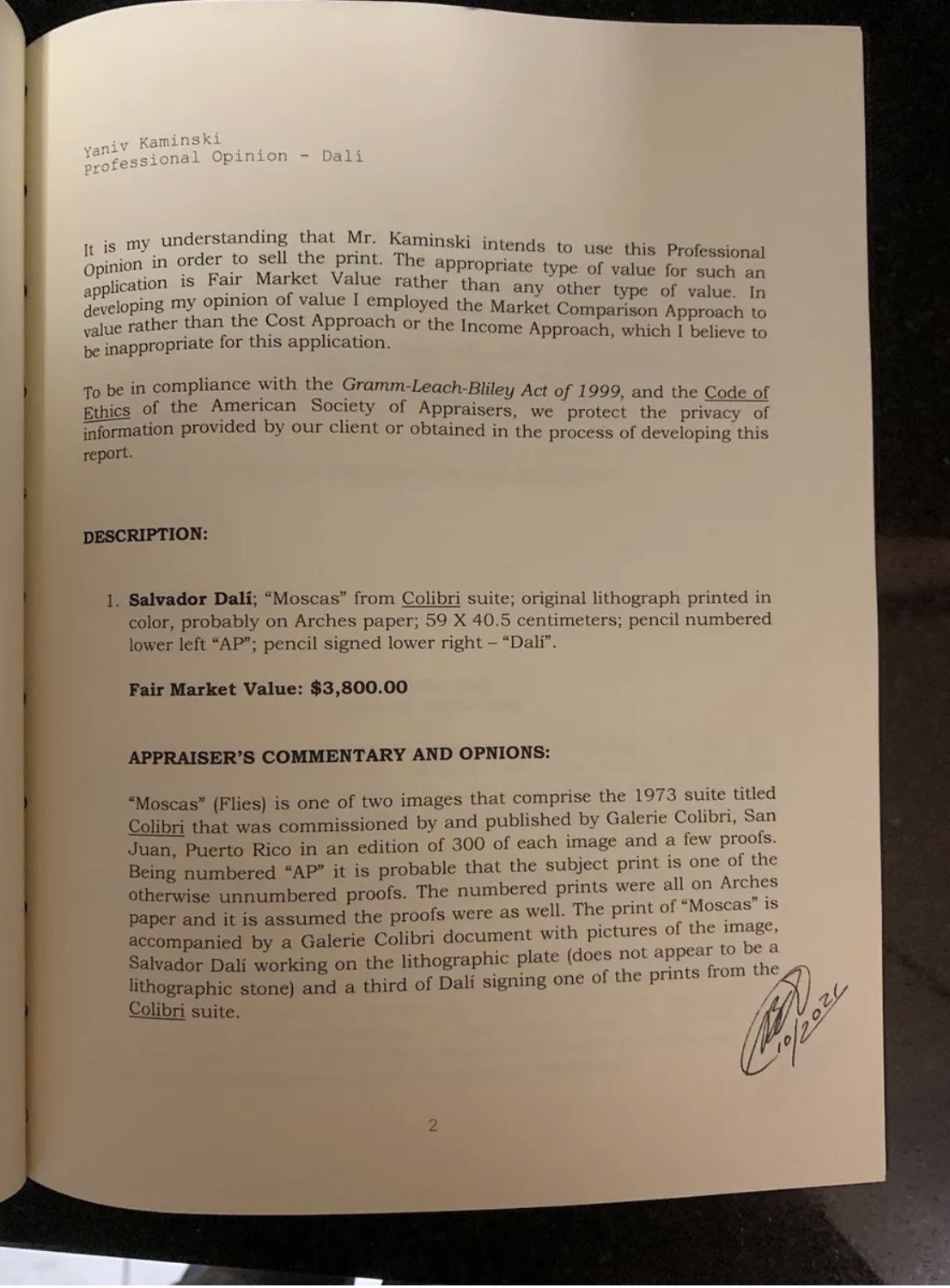Salvador Dali personally Signed Lithograph “Moscas” Colibri Suite RARE A.P EditionSalvador Dali Authentic Hand Signed Lithograph “Moscas” Colibri Suite Professionally appraised BY Bernard Ewell one of the top Dali art appraisers in the world, this piece was part of the personal collection of Enrique Sabatar who was Salvador Dali’s personal assistant between 1(contact info removed) and comes with Rare photo taken by Sabatar of Dali signing the piece.BEWARE OF FAKE ART and always make sure the pieces you purchase are authenticated and appraised by well known professionals!NO OTHER DALI LITHOGRAPH ON THE PRIVATE MARKET HAS THIS LEVEL OF AUTHENTICATION ,100% GUARANTEED GENUINE.