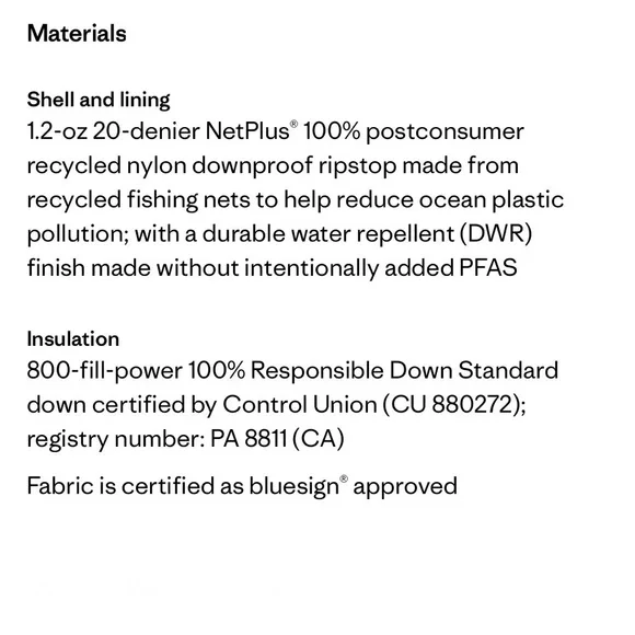 New with tags! Spring 2025 model. The perfect warmth for just about everything, our classic Down Sweater™ is lightweight and windproof with a shell built of NetPlus® 100% postconsumer recycled nylon ripstop made from recycled fishing nets to help reduce ocean plastic pollution, and it´s insulated with 800-fill-power 100% Responsible Down Standard down certified by Control Union (CU 880272).BLK | Style No. 84675