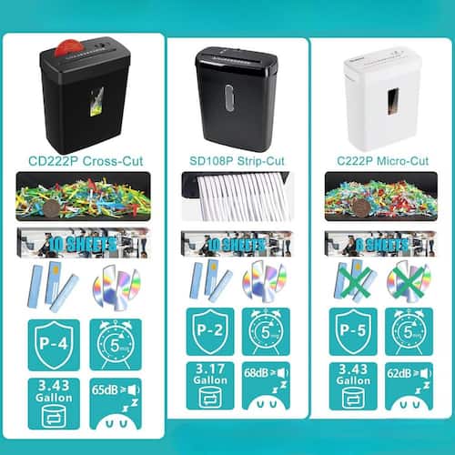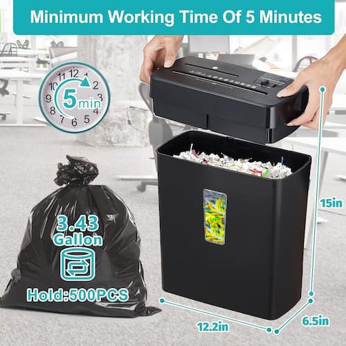 About This Product:Keep your sensitive information secure with this 10-Sheet Cross Cut Paper Shredder featuring a P-4 security level, shredding paper, credit cards, and CDs into 5/32 in. x 1-17/32 in. pieces. Equipped with a jam-proof cutter and a user-friendly 3-mode control switch (Auto, Off, Reverse), it delivers seamless operation and up to 5 minutes of continuous shredding. The compact design includes a 3.43 gal. basket with a transparent window and a portable handle, making it perfect for any home or small office.