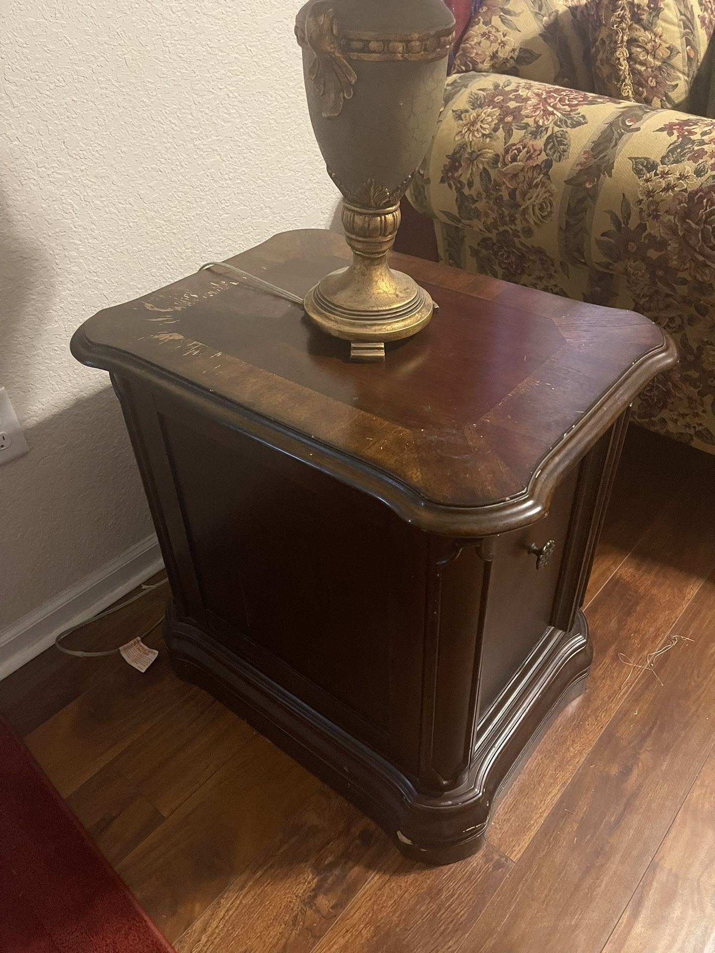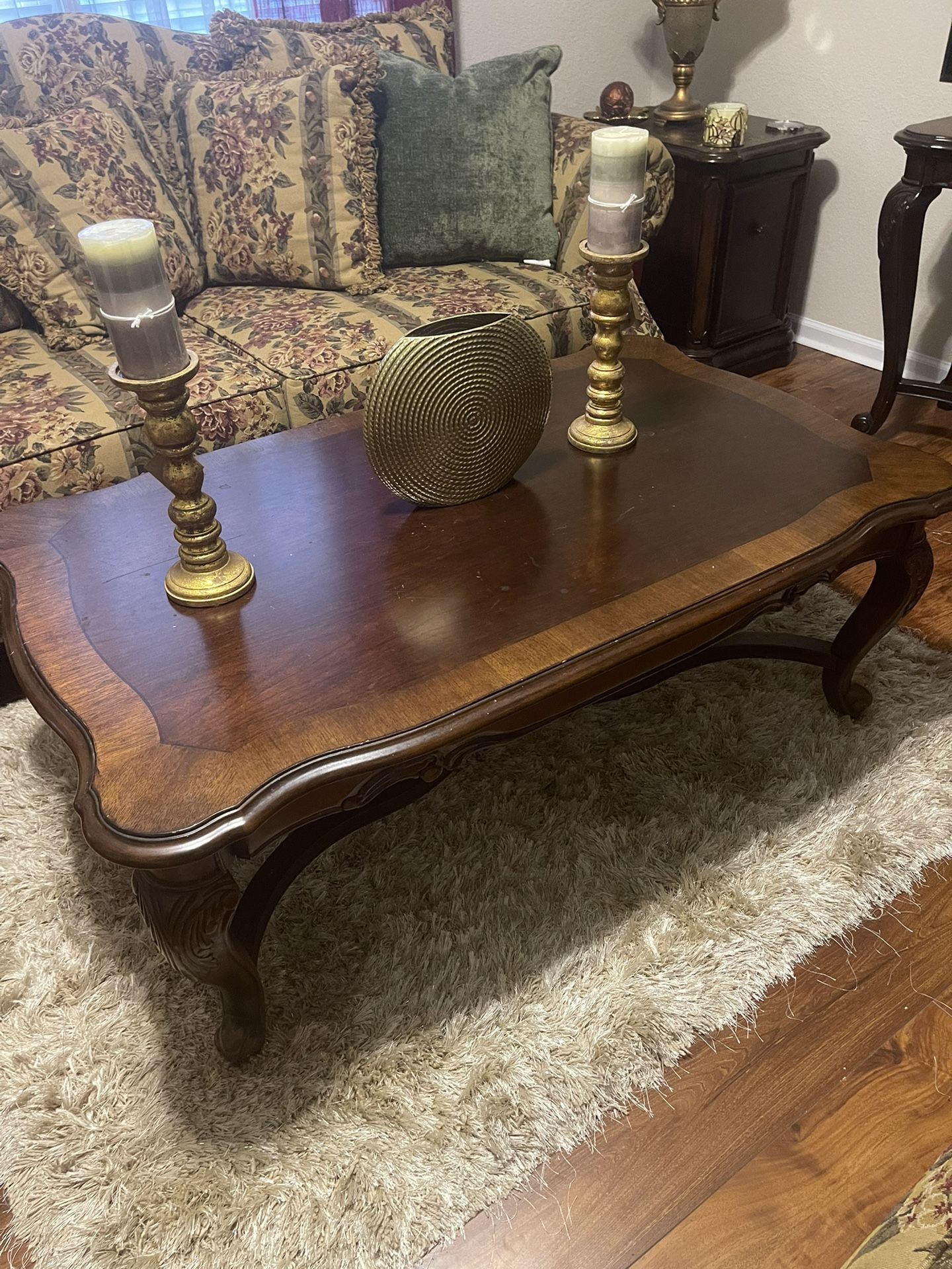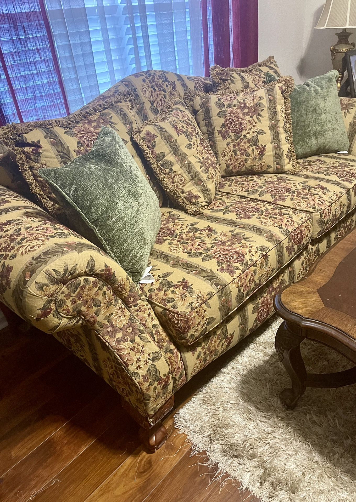 Six piece Ashley Brand living room set. Sofa, love set, recliner and 3 living room tables some water marks on tables.
