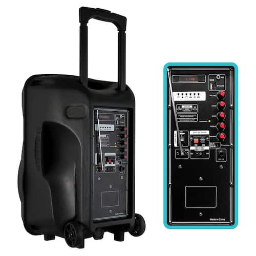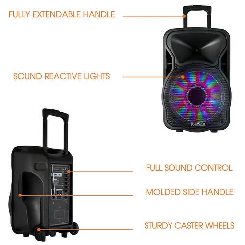 About This Product:The BEFREE SOUND 12 in. Bluetooth Rechargeable Portable Party PA Speaker with Illuminating Lights brings more power and sound to house parties and other events. Dazzle the stage with an array of illuminating light patterns built into the speaker. Bring along to camping trips or backyard barbeques, with the portable handle bars and wheels this party speaker can go anywhere. Great for an at home or dive bar karaoke night; this sound set comes with a microphone as well function karaoke controls. Never let the party simmer down, the rechargeable battery can last till the night ends.