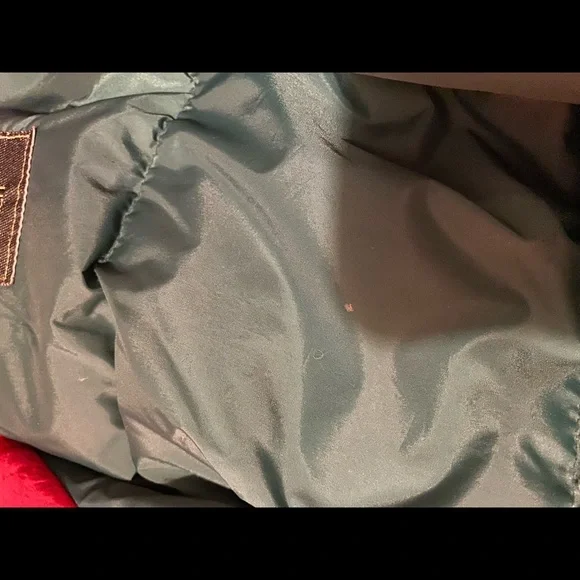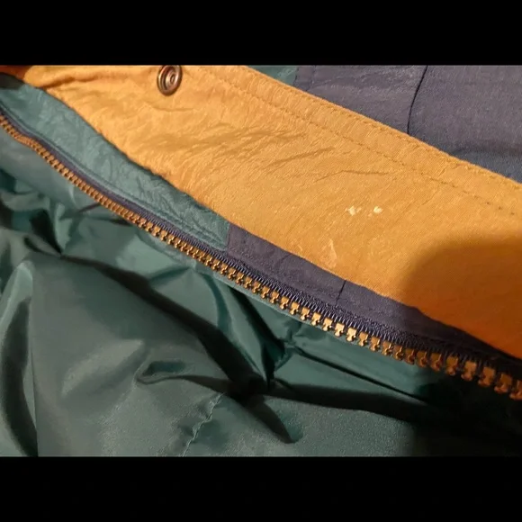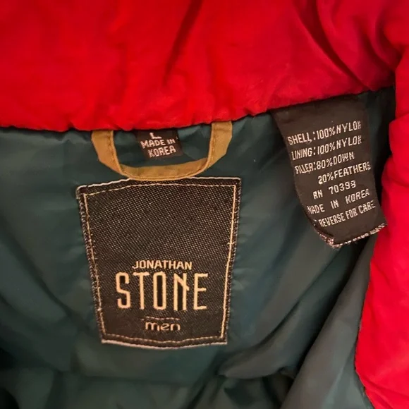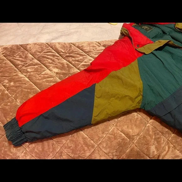 Johnathon Stone vintage 80s/90s colorblock puffer jacket with elastic waist, size large. 100% nylon and filler is 80% down and 20% feather. Two small stains but could be lifted with some detergent. Measurements: shoulder to sleeve cuff - 26”, collar to hem - 25”, width - 24” Extremely unique and WARM addition to your closet!