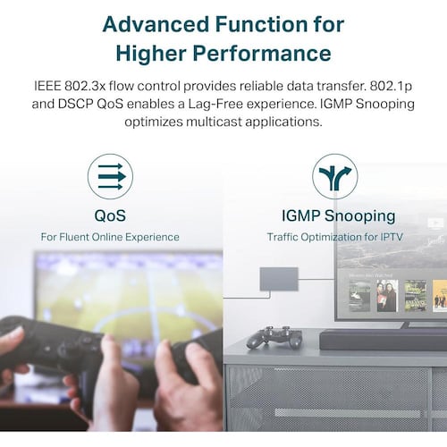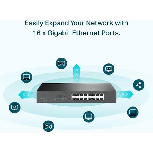 About This Product:Enhance your network with this 16-port gigabit switch, designed to deliver high-speed connectivity for both home and business environments. With advanced features like IGMP snooping, VLAN support, and port-based QoS, this switch ensures efficient and seamless data traffic management, boosting overall performance. Its sturdy, metal construction is built for reliability and durability, and it supports large file transfers with ease, making it perfect for demanding tasks. Whether you´re managing a small office or a larger network, this switch will help you streamline your data management, ensuring minimal latency and maximum productivity.