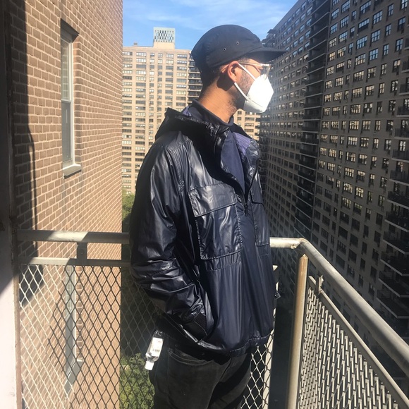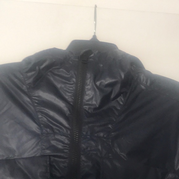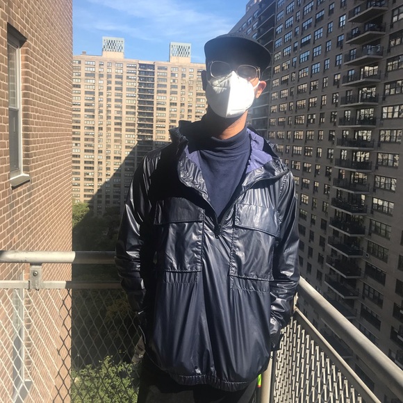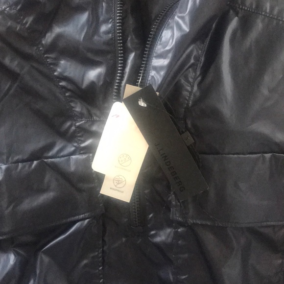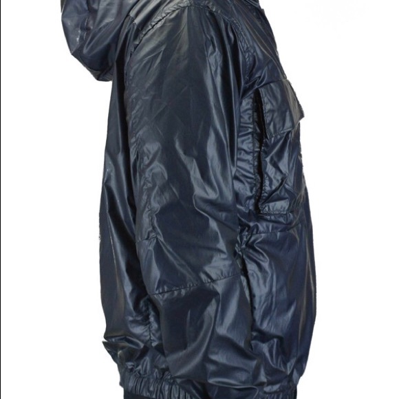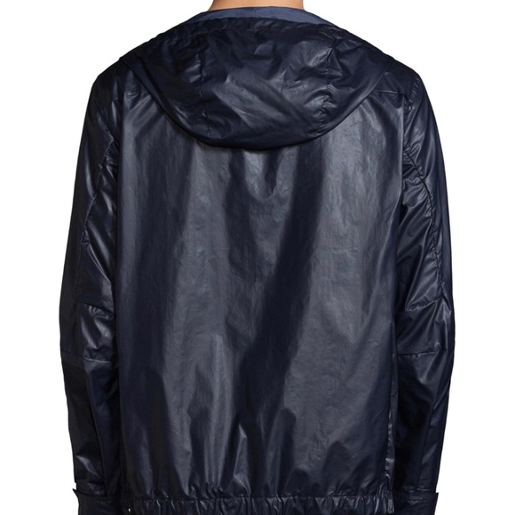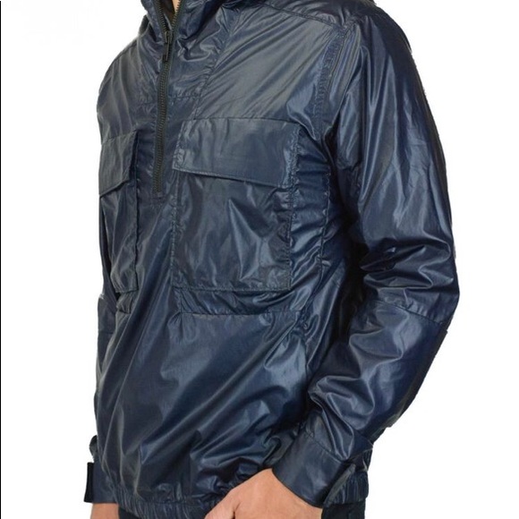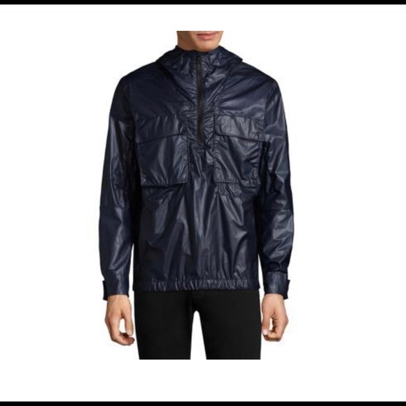 J. Lindeberg Randy Pullover Rain JacketDetails:Dark navy blueRubber coated nylon1/4 zipVelcro CuffsElasticized bottom hem2 large Velcro breast pockets2 zip slit pockets