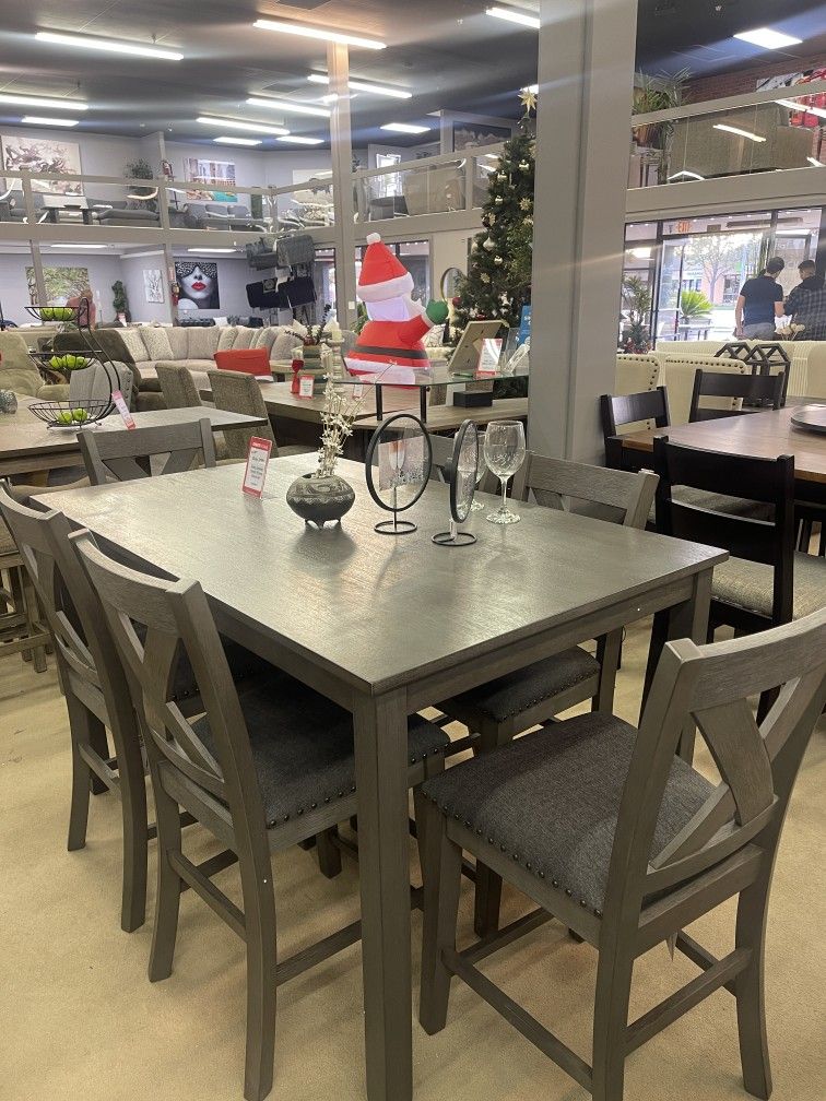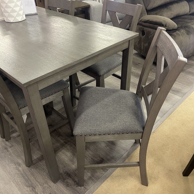 Includes counter height dining table and 6 counter height bar chairsrNailhead accentsrQty Per Carton: 7rTable:60" x 36" x 36"HrChair: 18.5" x 21.13" x 40.75"HrrrCome visit our showroom at 2235 N Tustin Ave. OrrShop online at ornatehome.comrrEnjoy unlimited item delivery for only $99.rrExplore our wide range of furniture options, including dining room sets, bedroom furniture, sectionals, sofas, recliners, sleeper sofas, rugs, wall art, mattresses, bedding, kids´ room furniture, office furniture, vanities, bookcases, and much more.rrWe proudly carry brands such as Ashley Furniture, Tempur-Pedic, Sealy, and Stearns & Foster.