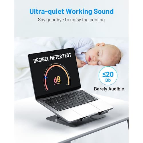 Unlike standard cooling pads, this stand utilizes thermoelectric cooling (peltier effect), rapidly lowering the surface temperature to 47℉ in just 3 seconds, the built-in semiconductor cooling panel works alongside 2 ultra-quiet fans to absorb and dissipate heat, efficiently keeping your laptop cool, whether you´re gaming, streaming, or handling processor-heavy tasks, this high-tech cooling system ensures your device stays at an optimal temperature