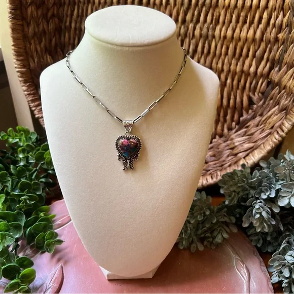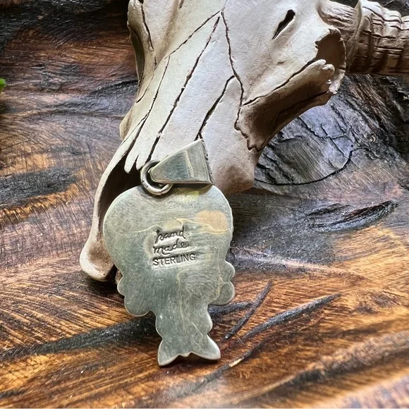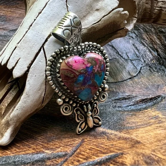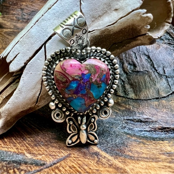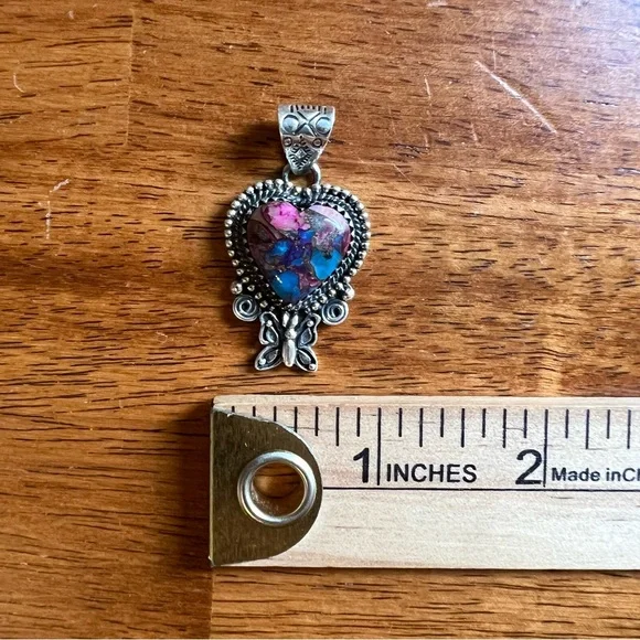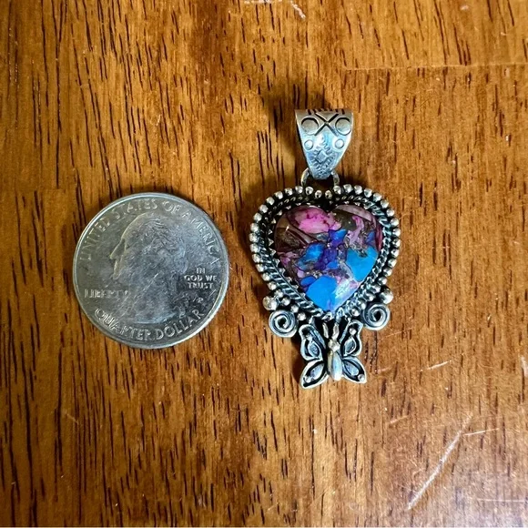 This is a beautiful sterling silver and Dahlia Turquoise heart pendant with a delicate butterfly detail just beneath the stone. The Dahlia Turquoise has a gorgeous blend of pinks, purples, blues, and golden tones—all artistically combined into a composite stone that’s full of color and charm.The back is solid and stamped with both HANDMADE and STERLING, and the roomy bail is beautifully stamped—ready for your favorite chain or cord. It’s a well-crafted, nature-inspired piece with lovely detail and excellent presence.Photos were taken in natural sunlight, but please note that colors may vary slightly depending on your lighting or device. Chain is not included and is shown for display purposes only.⸻Details:• Metal: 925 sterling silver• Stone: Dahlia Turquoise (composite stone made from a mix of stones and minerals)• Design: Heart with butterfly detail• Stamps: HANDMADE and STERLING (on solid back)• Bail: Wide and stamped• Condition: Handcrafted with quality and care• Shown with: Quarter for scale – chain not included⸻Please note: Dahlia Turquoise is a composite stone, made by artfully combining multiple natural stones and minerals to create unique patterns and colors. These variations are intentional and part of the stone’s distinct beauty.